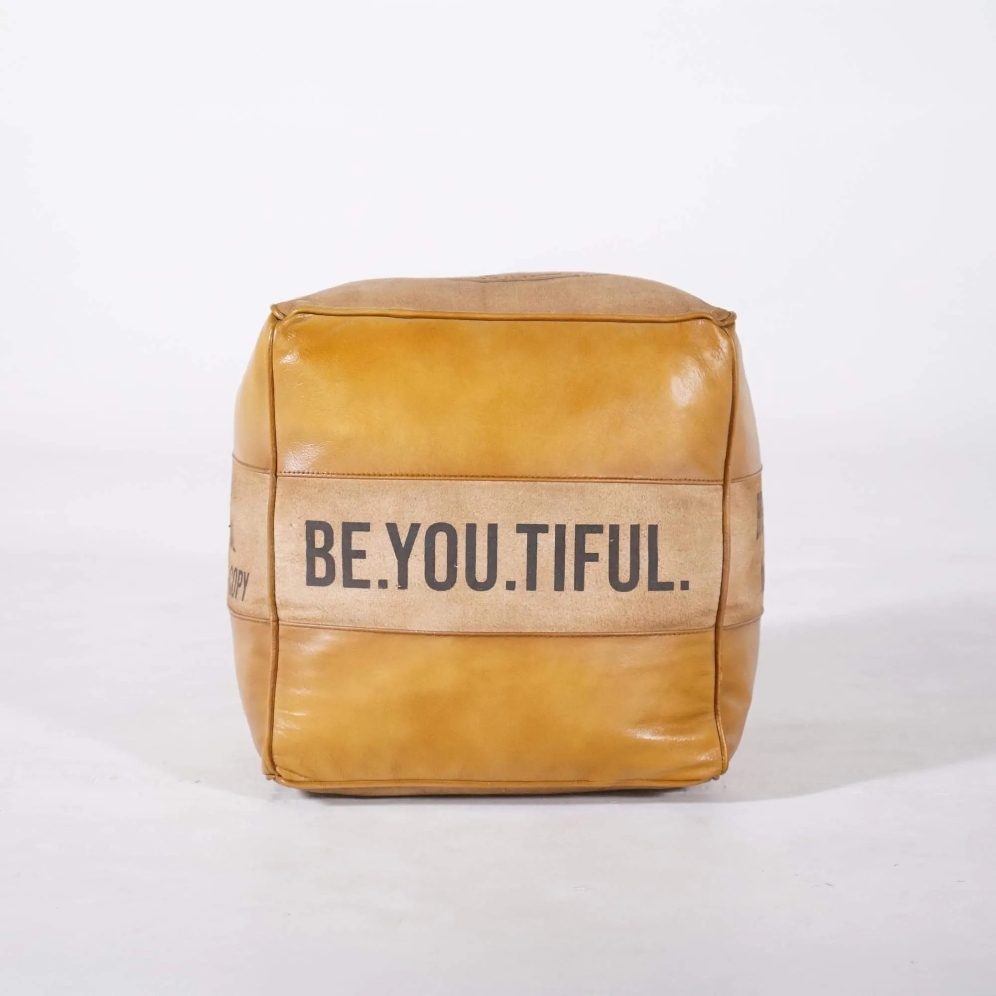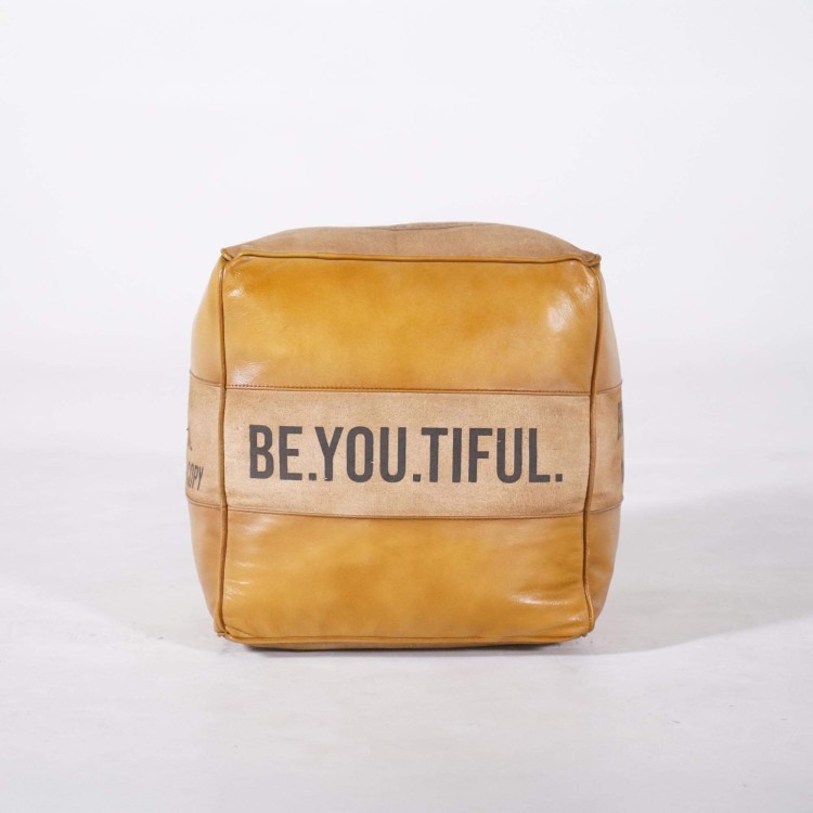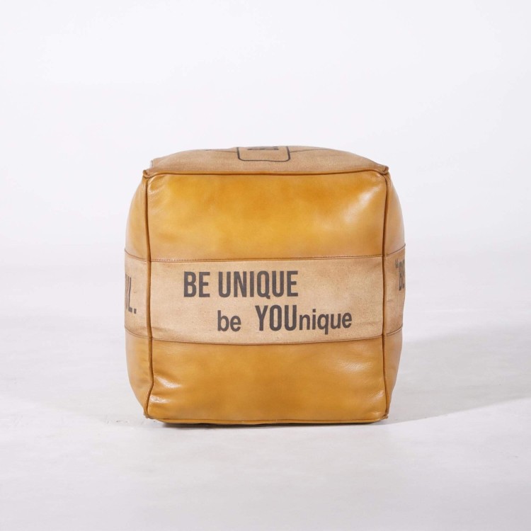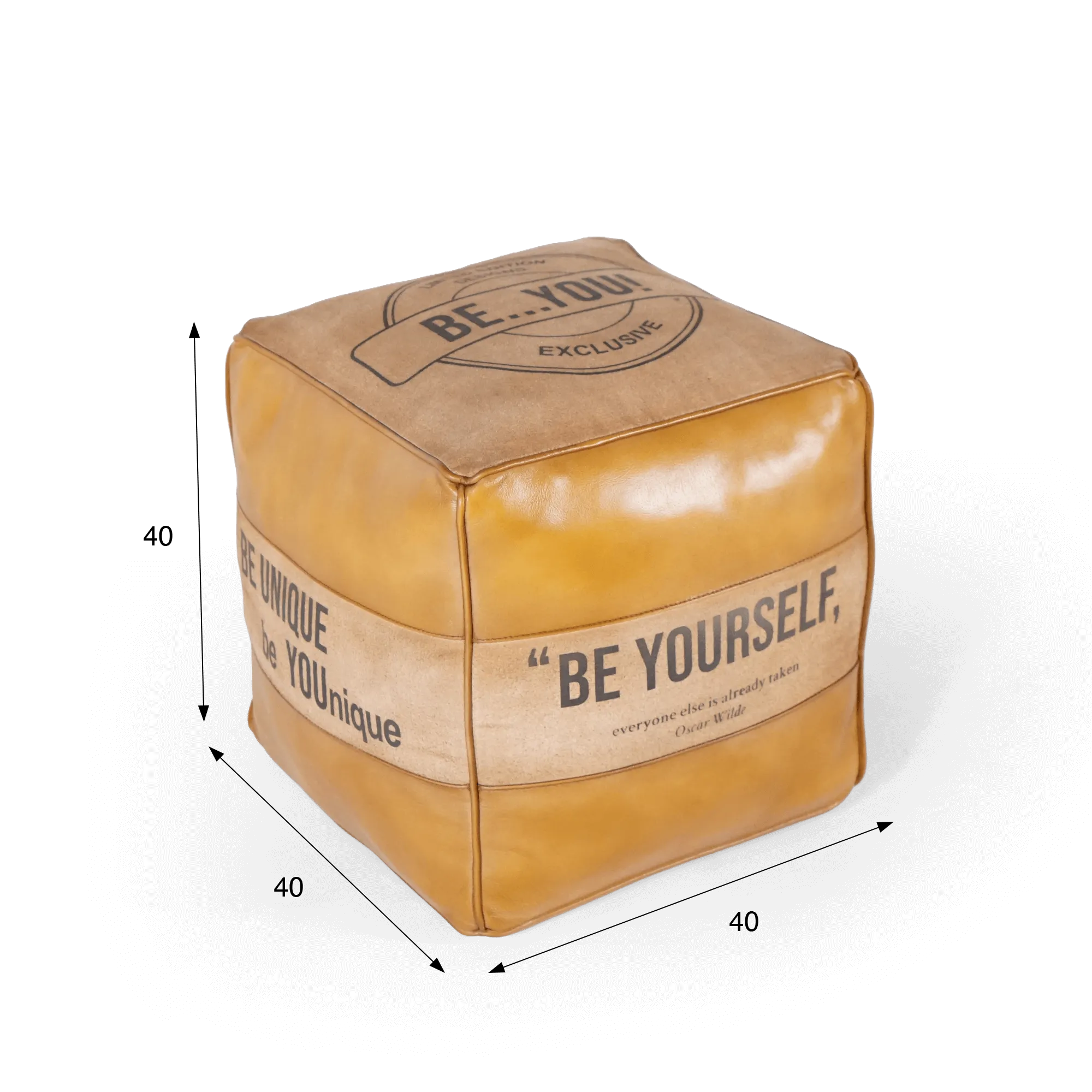 Lassen Sie sich von unserem Sitzhocker aus Naturleder und Stoff "Be Yourself" verzaubern. Dieses vielseitige Dekorationsobjekt wurde entworfen, um Ihr Zuhause mit seinem industriellen Look und inspirierenden Zitaten wie dem von Oscar Wilde: "Sei du selbst, die anderen sind schon vergeben" zu veredeln. Dieser Pouf ist eine echte Inspirationsquelle für den Alltag und verkörpert Selbstvertrauen und Komfort im Alltag.