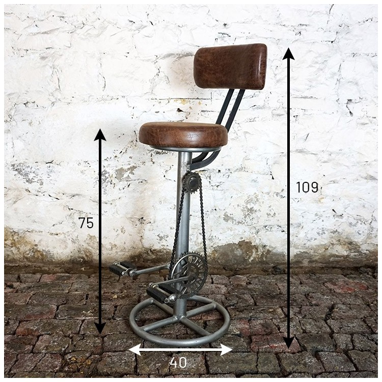 Auf einem soliden grauen Metallrahmen, der von Fahrradkurbeln mit Pedalen und einer Kette auf Zahnrädern inspiriert ist, ruht dieser Barstuhl nicht nur stabil, sondern wird mit seinem industriellen Look auch nicht unbemerkt bleiben. Dank seines unerwarteten Designs verleiht dieser Industrial-Hocker einer Einrichtung, die auf der Suche nach Fantasie ist, einen Hauch von Originalität. Ein Grund mehr, sich auf den Sattel zu schwingen.