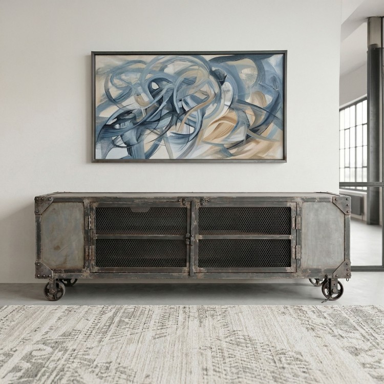 Dieses 180 cm lange TV-Möbel verfügt über eine lange Platte für Ihren Bildschirm und ist hinten auf der ganzen Länge gelocht, damit Sie die Kabel Ihrer Hightech-Geräte durchziehen können. Auf vier Vintage-Rollen installiert, lässt sich dieses Wohnzimmermöbel sehr leicht bewegen. Das zentrale Regal ist über die gesamte Länge des Möbelstücks offen, sodass Sie flexibel entscheiden können, welche Gegenstände oder Geräte Sie im Inneren des Möbelstücks aufbewahren möchten. Die Nutzhöhe über und unter dem mittleren Regal beträgt 19 cm. Das robuste Metallgestell verleiht diesem industriellen TV-Möbel eine außergewöhnliche Haltbarkeit. Sein industrieller und moderner Look passt perfekt zu zeitgenössischen oder Loft-Einrichtungen und verleiht dem Möbelstück einen unverwechselbaren Charakter.