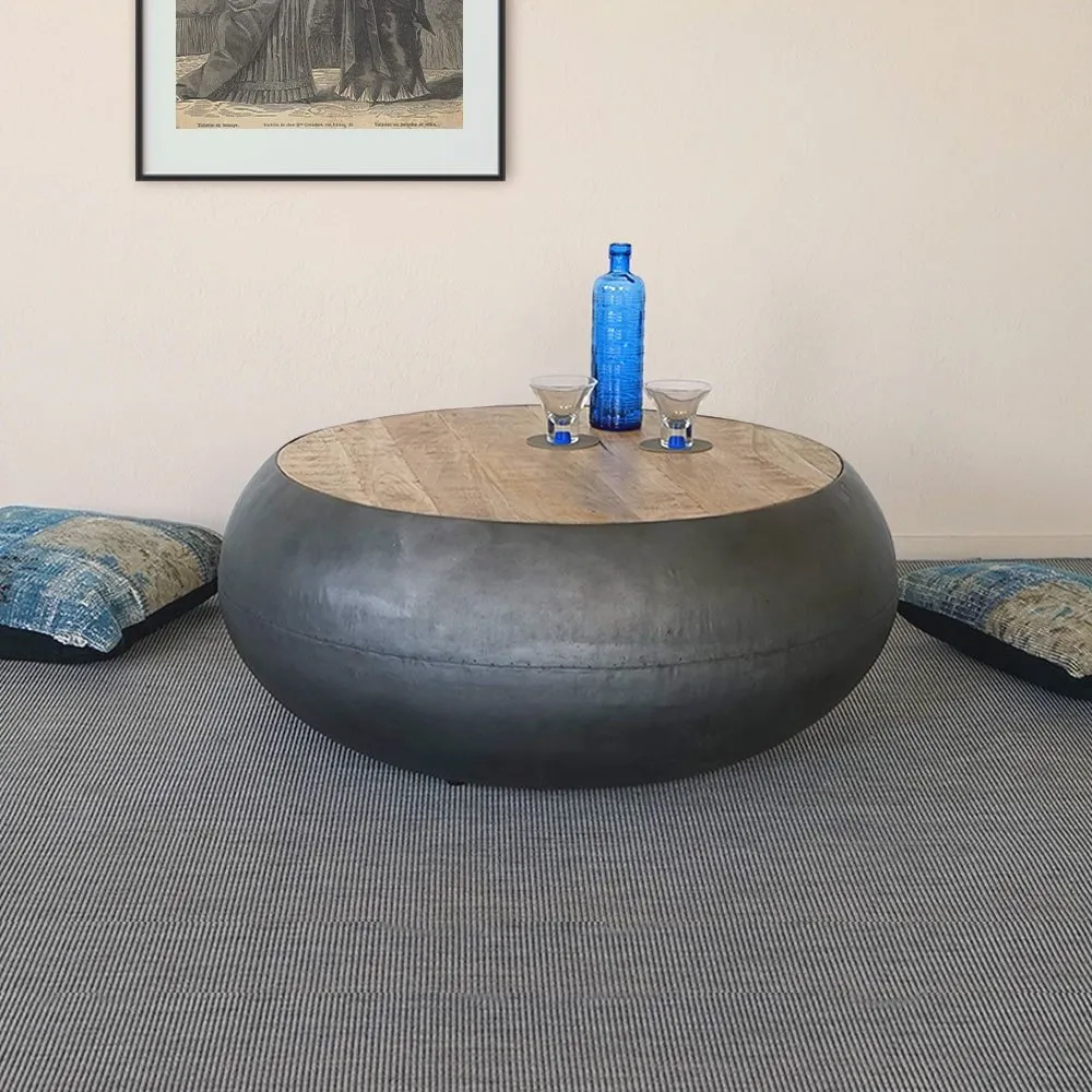 Für eine vollkommen harmonische Raumkomposition verstärkt die Kombination dieses runden Couchtisches aus Massivholz und Metall im Industriestil mit einer unserer Sofakollektionen die Gesamtwirkung des Interieurs.