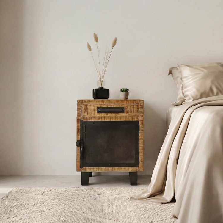 Der Nachttisch Brooklyn verbindet Holz und schwarzes Metall auf subtile Weise zu einem wunderschönen Möbelstück im Industriedesign, das Ihrem Schlafzimmer viel Charakter verleihen wird.