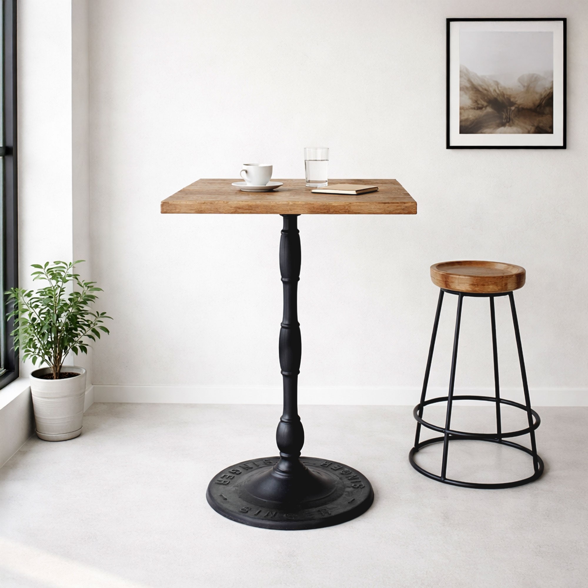 Der quadratische Bistro-Stehtisch ist eine perfekte Kombination aus Holz und Metall und bietet Platz für 2 bis 4 Personen, sei es für einen Drink, einen Aperitif oder sogar eine Mahlzeit.