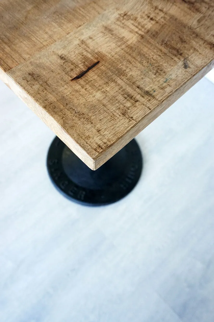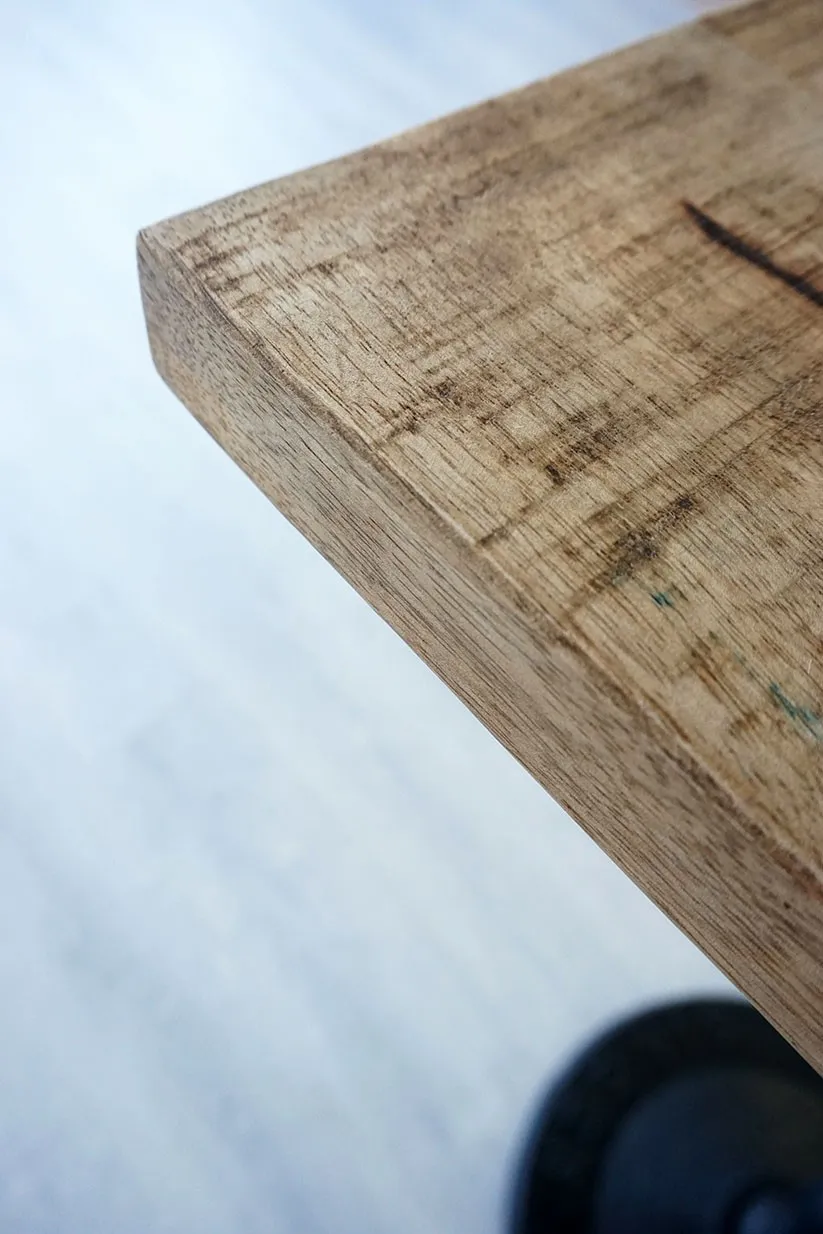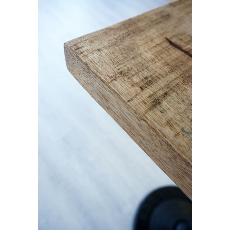 Die quadratische Tischplatte ist aus massivem Mangoholz gefertigt, das mit einem Fleckenschutz behandelt wurde, um eine einfache Pflege zu gewährleisten.