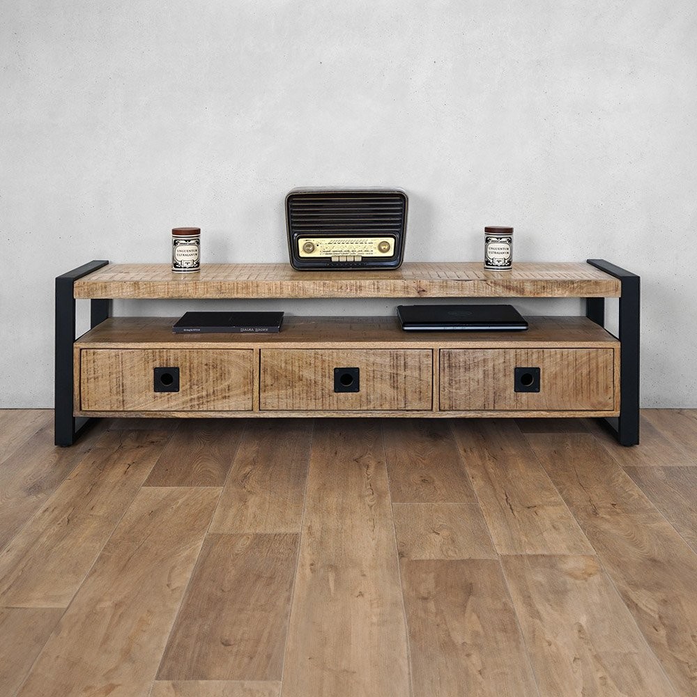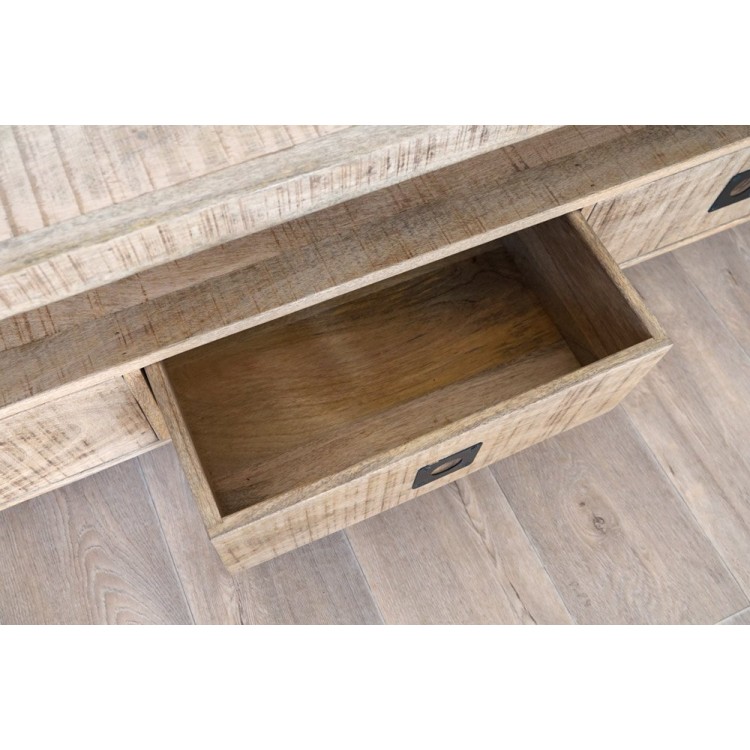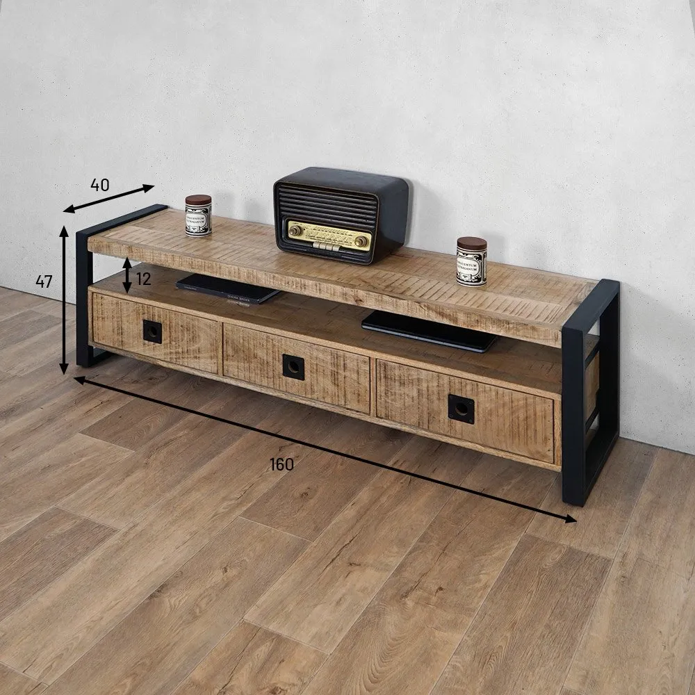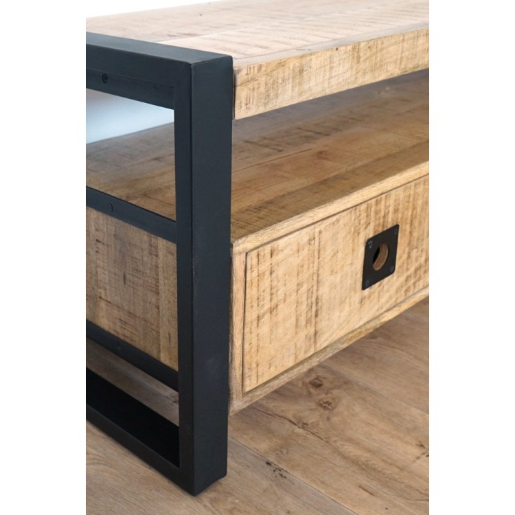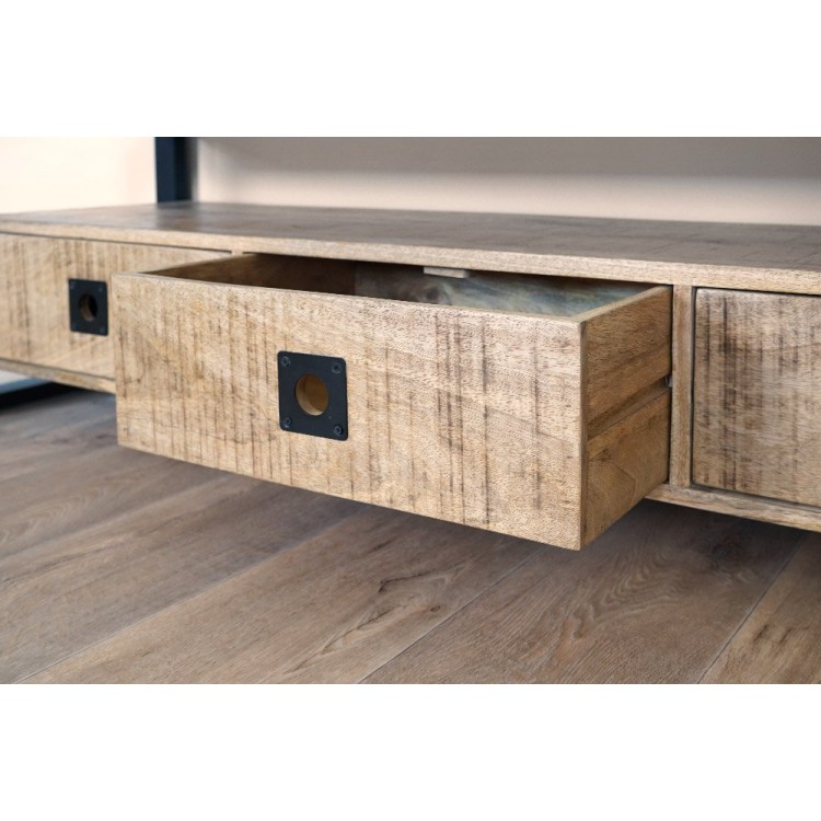 Dieses wunderschöne, 160 cm lange TV-Möbel aus Mangoholz ist trendy und praktisch zugleich und wird ein echter Mittelpunkt Ihres Zimmers sein.