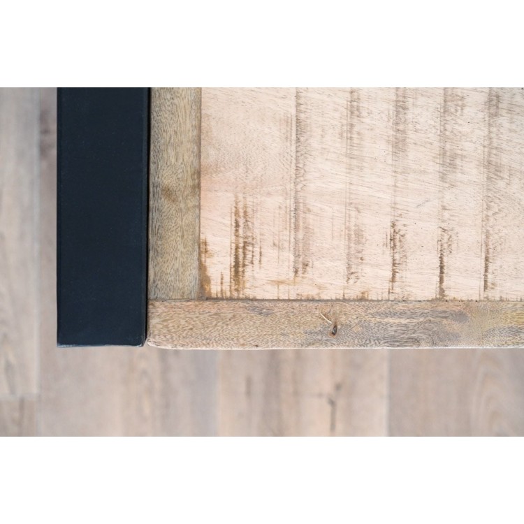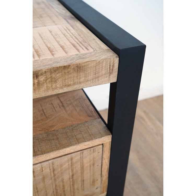 Der Tisch steht auf einem offenen Metallgestell, das die natürlichen Farbvariationen des unbehandelten Holzes hervorhebt und gleichzeitig einen modernen und eleganten Touch verleiht. Dank des verstärkten Stahlrahmens ist der TV-Ständer äußerst stabil.