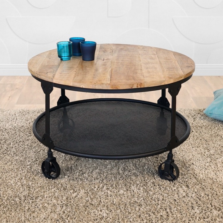 Entdecken Sie zum Beispiel den wunderschönen runden Industrial-Couchtisch mit Tischplatte aus Massivholz und Metallablage Wild West, gefertigt aus schwarzem Metall und massivem Mangoholz.