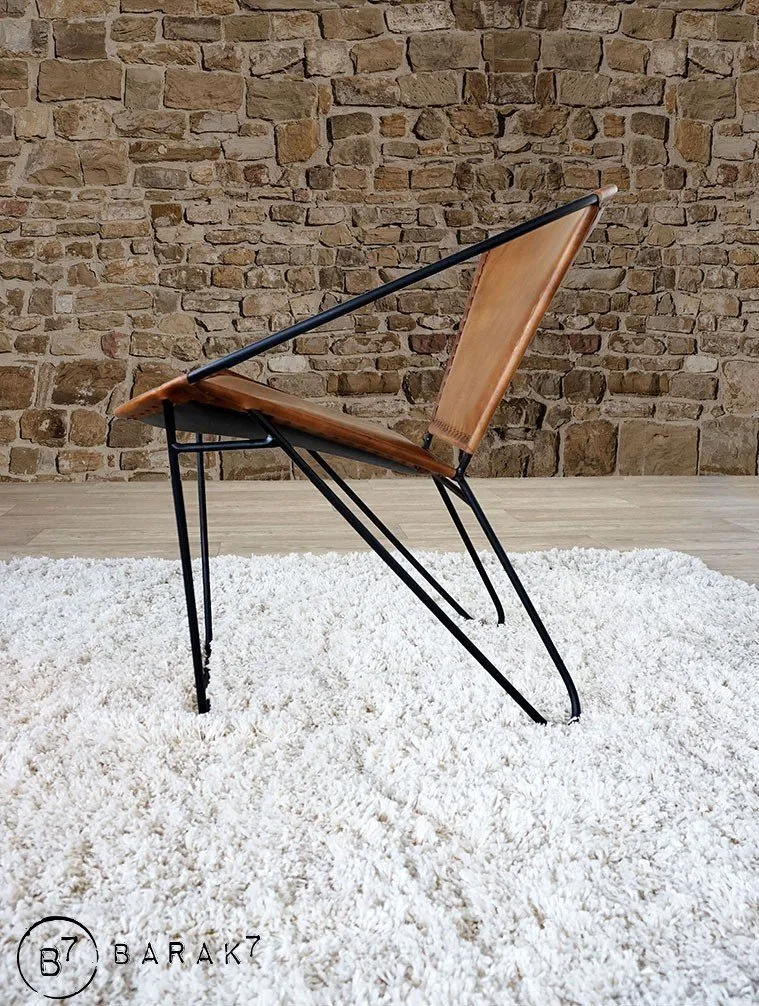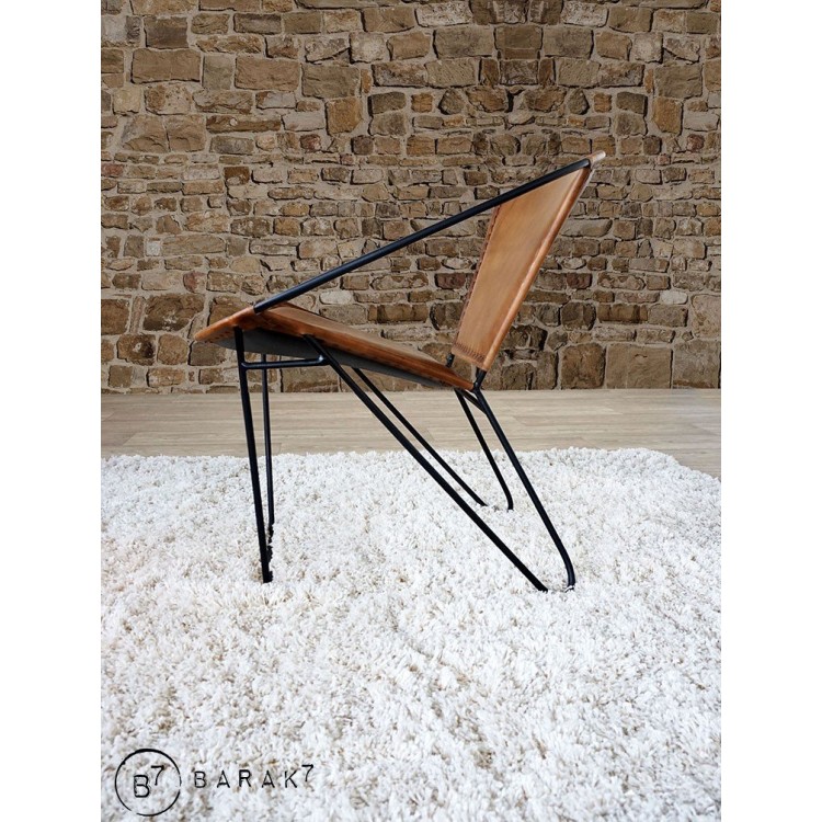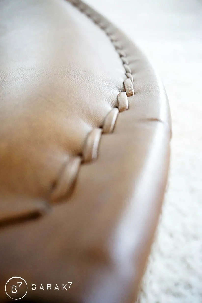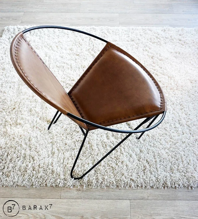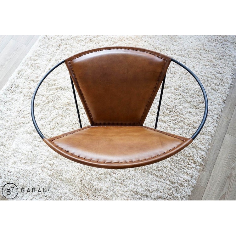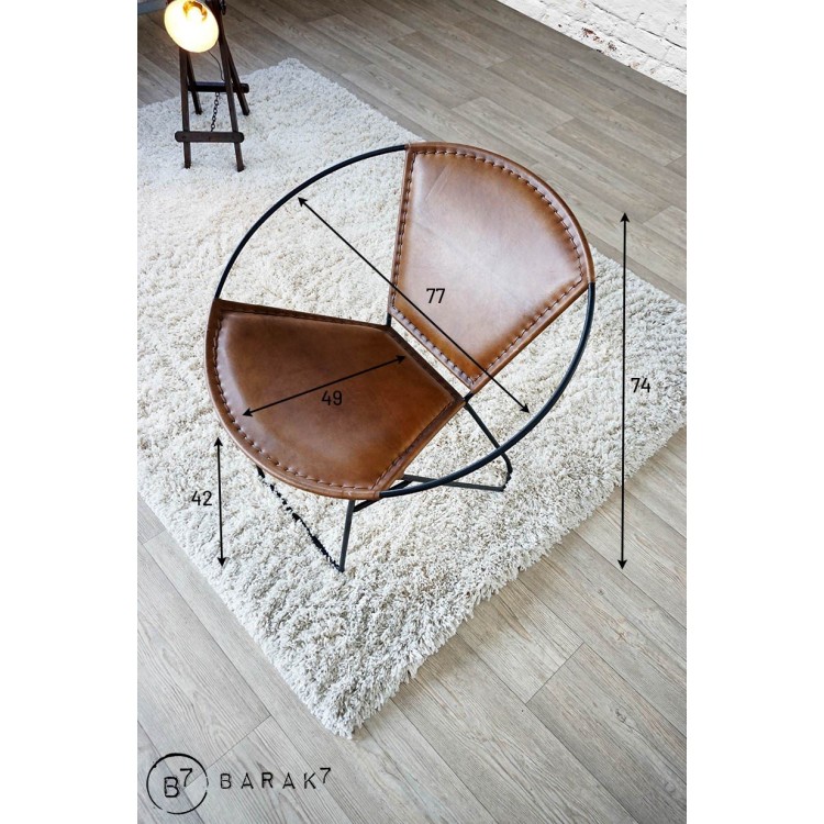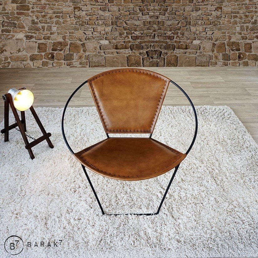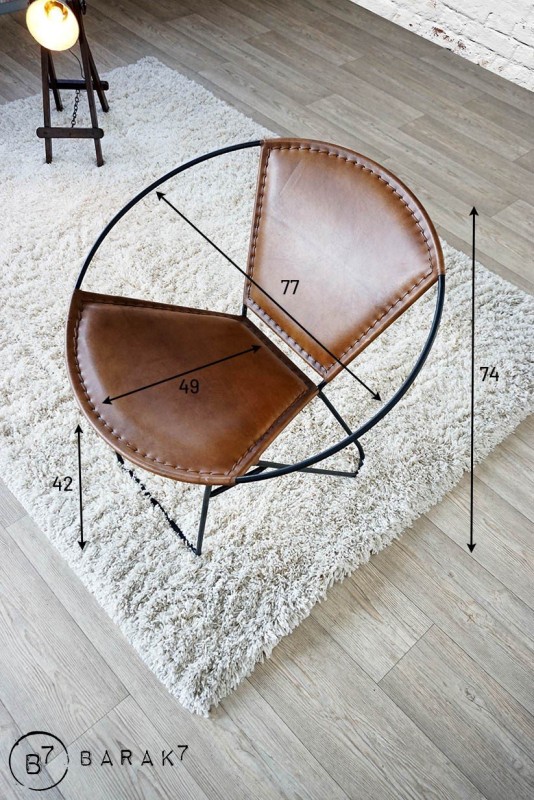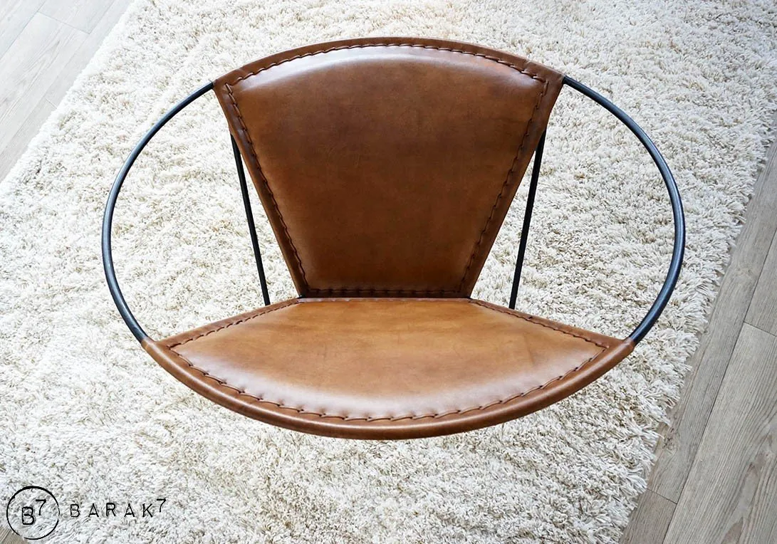 Die Sitzfläche und die Rückenlehne werden von einem schwarzen Metallring gestützt und sind aus dem warmen und edlen Material Büffelleder gefertigt. Die Verarbeitung wurde sorgfältig mit raffinierten sichtbaren Nähten durchgeführt.