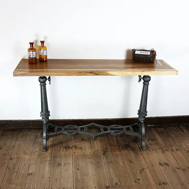 Im Eingangsbereich, im Schlafzimmer oder im Wohnzimmer wird diese Konsole mit ihrer Tischplatte aus Massivholz und dem stabilen Gusseisenfuß zum Mittelpunkt der Aufmerksamkeit.