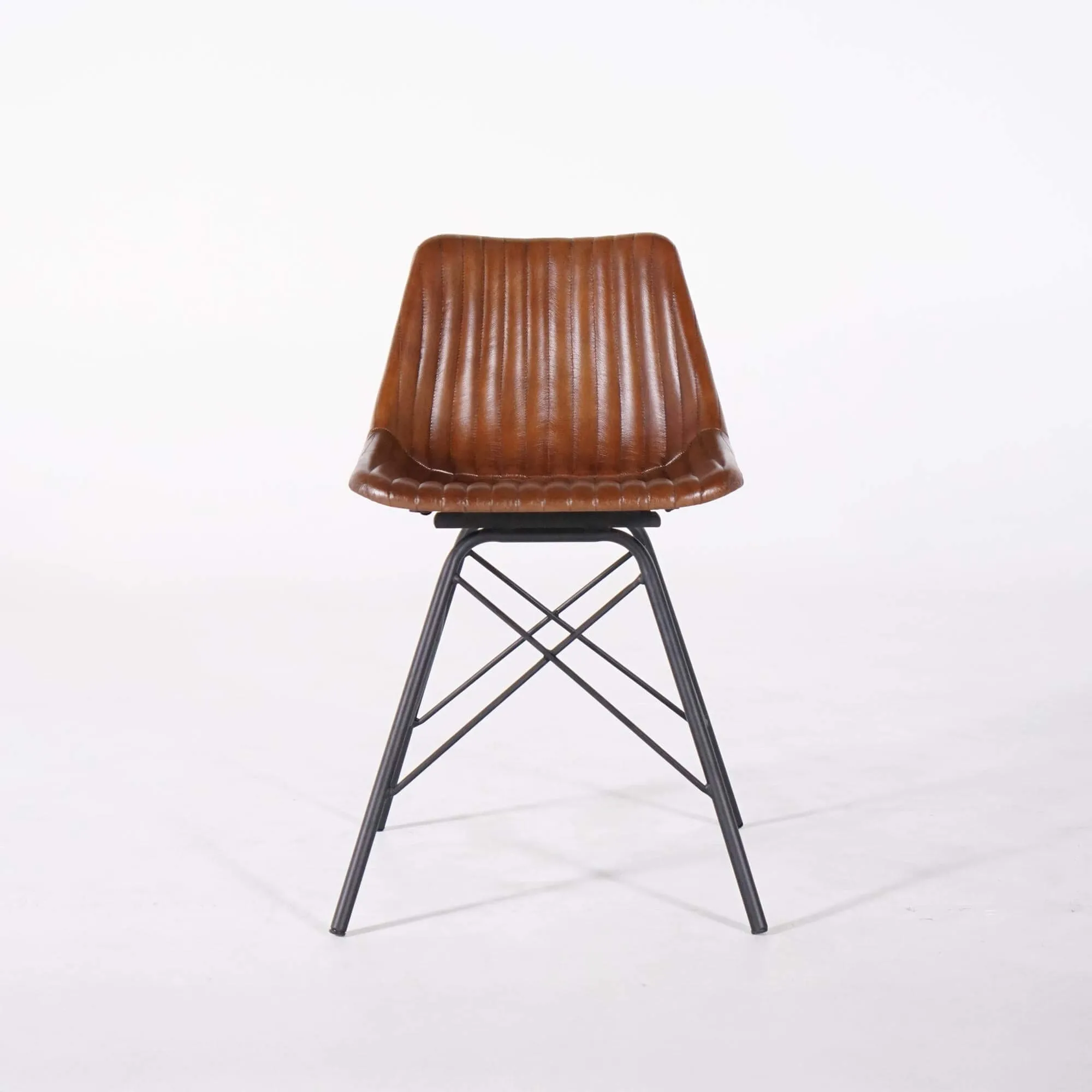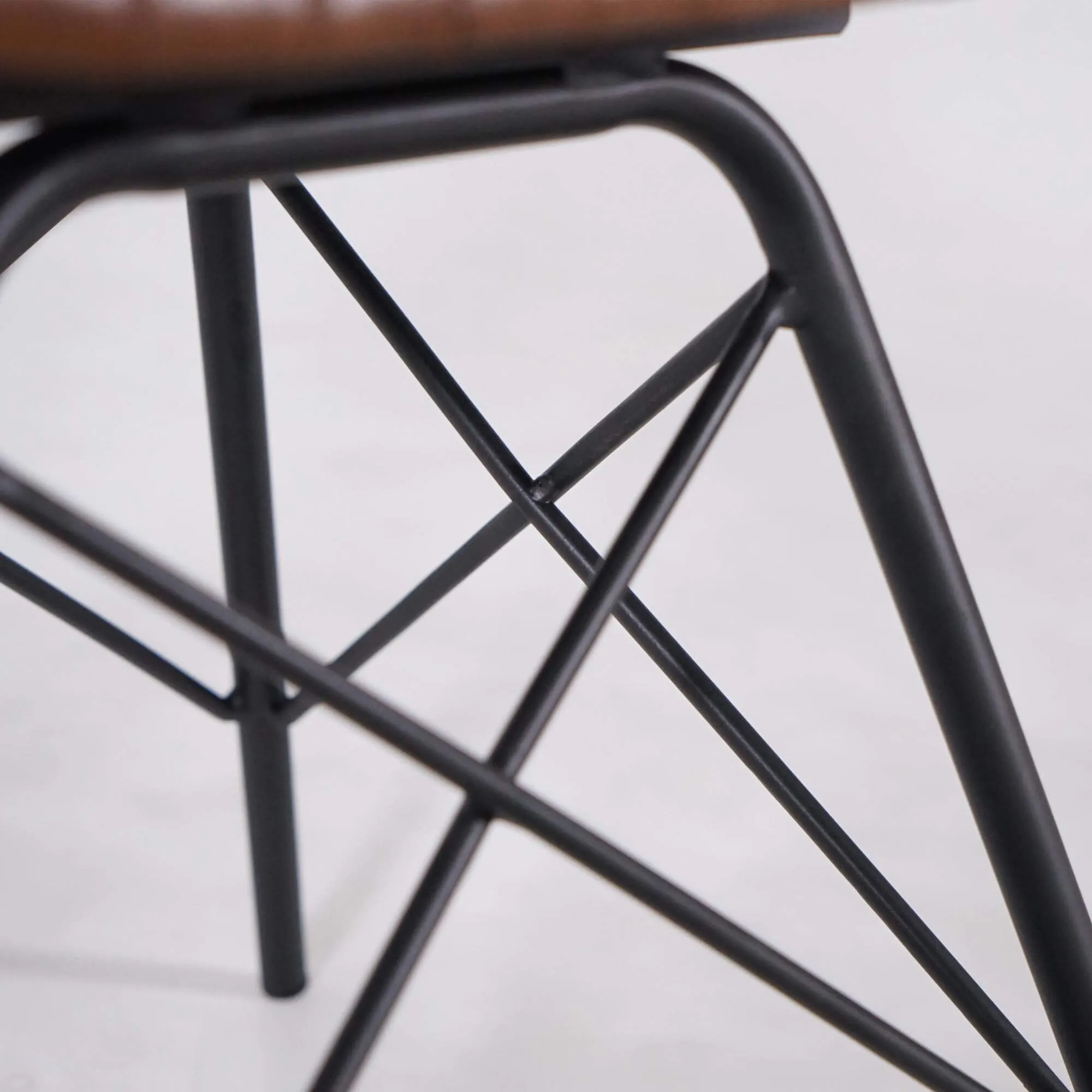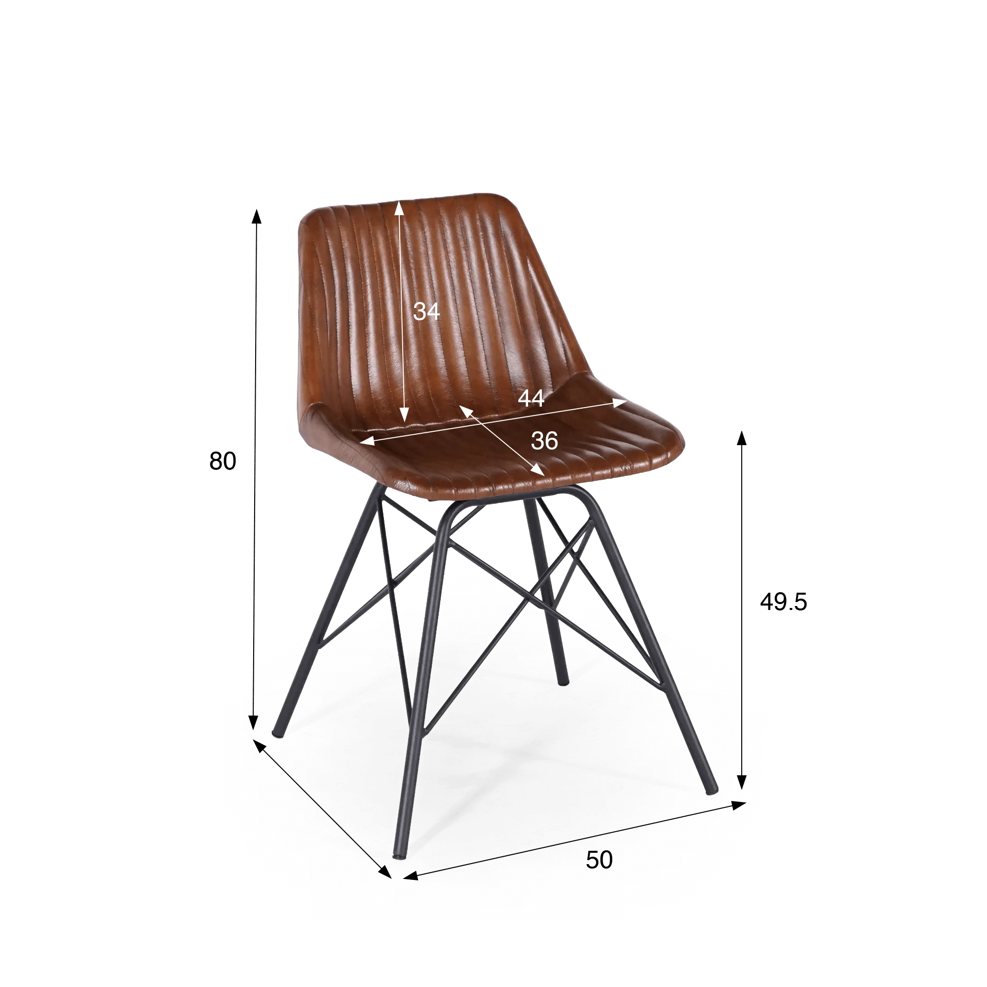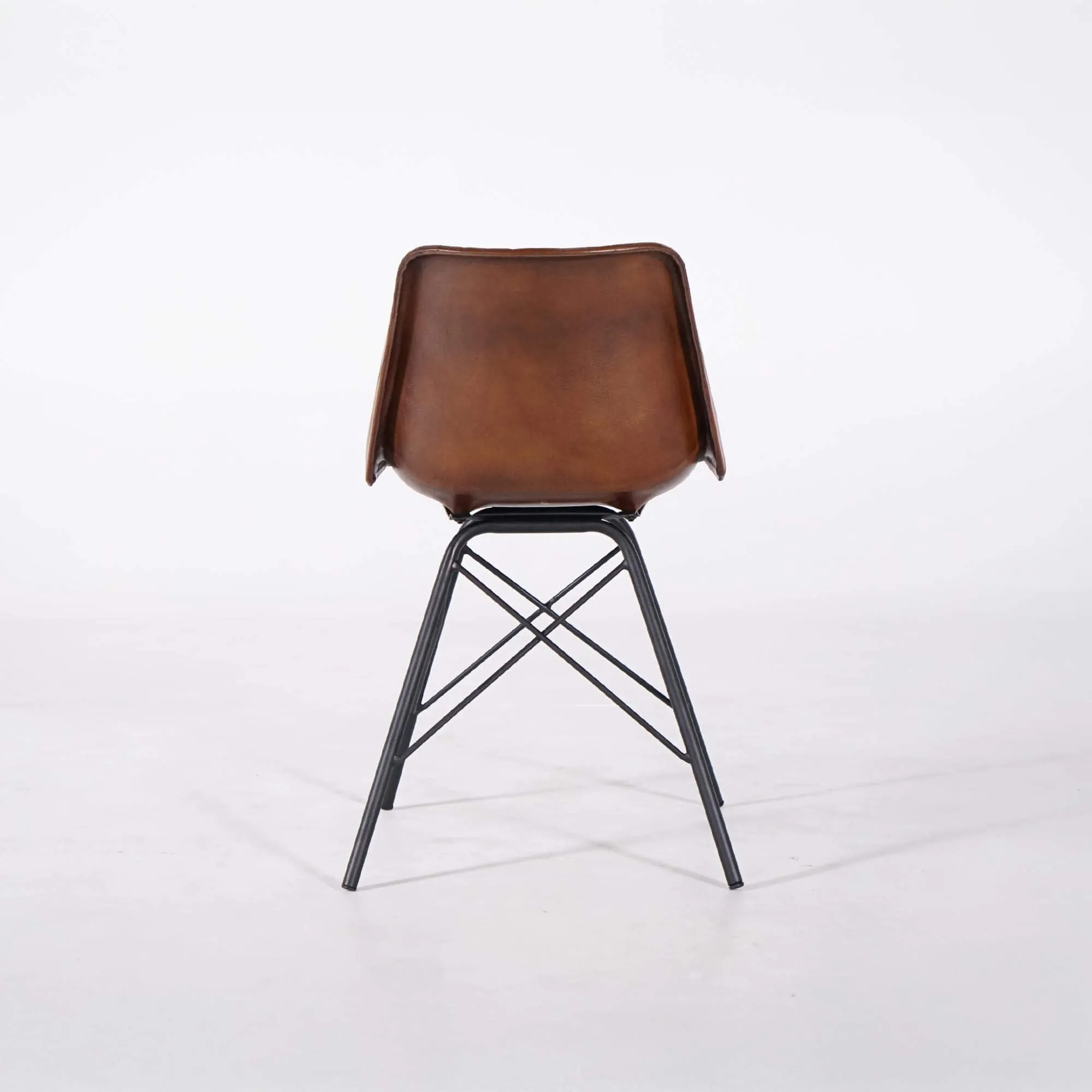Die Sitzfläche, 50 cm über dem Boden, besteht aus einer stabilen Sitzschale, die mit einer dünnen, bequemen Schaumstoffpolsterung versehen und mit echtem braunem Leder bezogen ist. Braunes Leder ist in der Einrichtung besonders beliebt, da es sich sehr leicht mit jedem Stil kombinieren lässt. Ob zeitgenössisch, industriell, vintage oder klassisch – er findet garantiert seinen Platz, ohne Stilbruch.