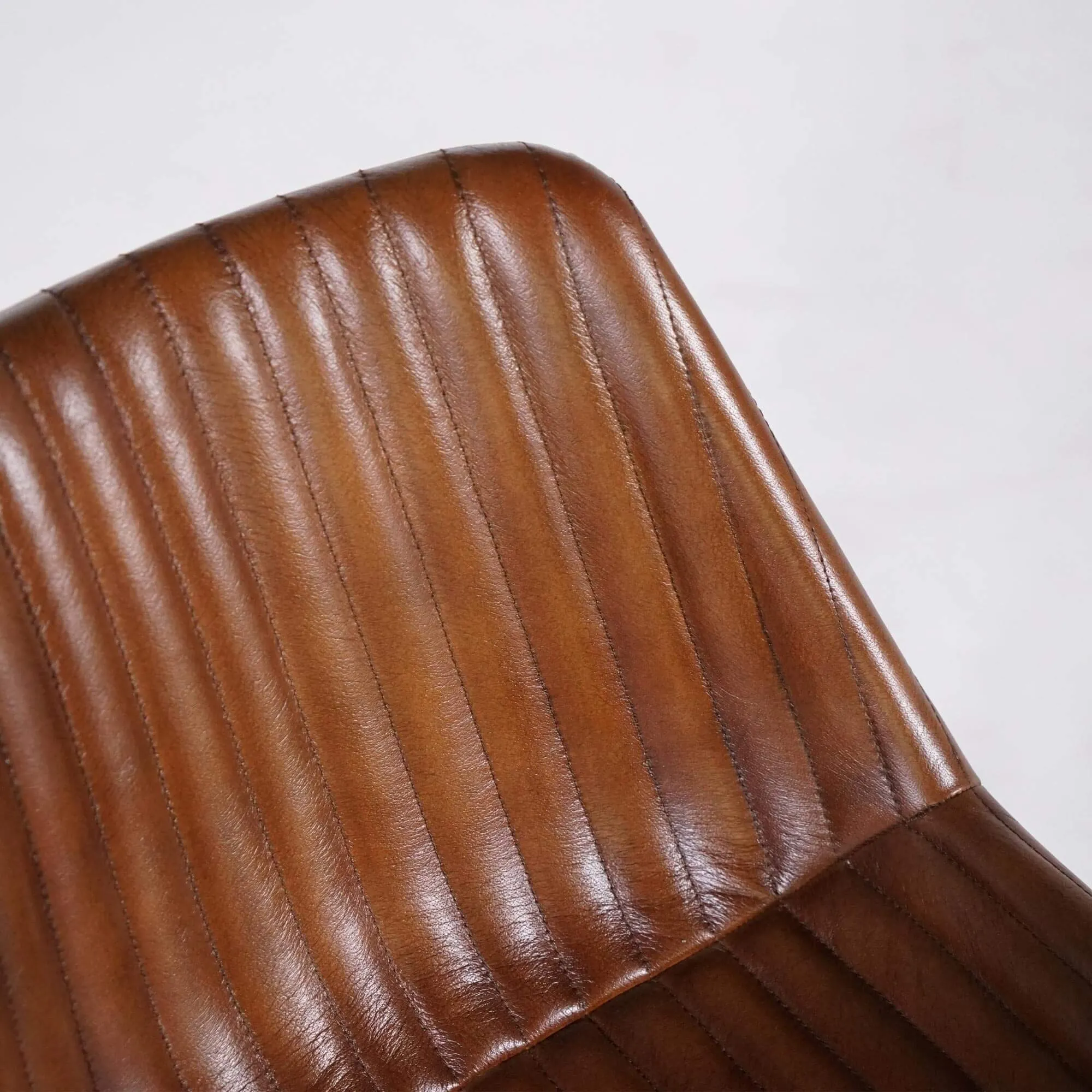 Dieser braune Lederstuhl im Vintage-Look zeichnet sich durch eine schicke und sorgfältige Optik aus. Die sichtbaren vertikalen Nähte bringen die natürlichen Nuancen des Leders zur Geltung und erzeugen ein elegantes Schattenspiel. Diese Verarbeitung verleiht diesem braunen Lederstuhl einen spürbaren Komfort, den Sie nach einem langen Familienessen besonders schätzen werden.
