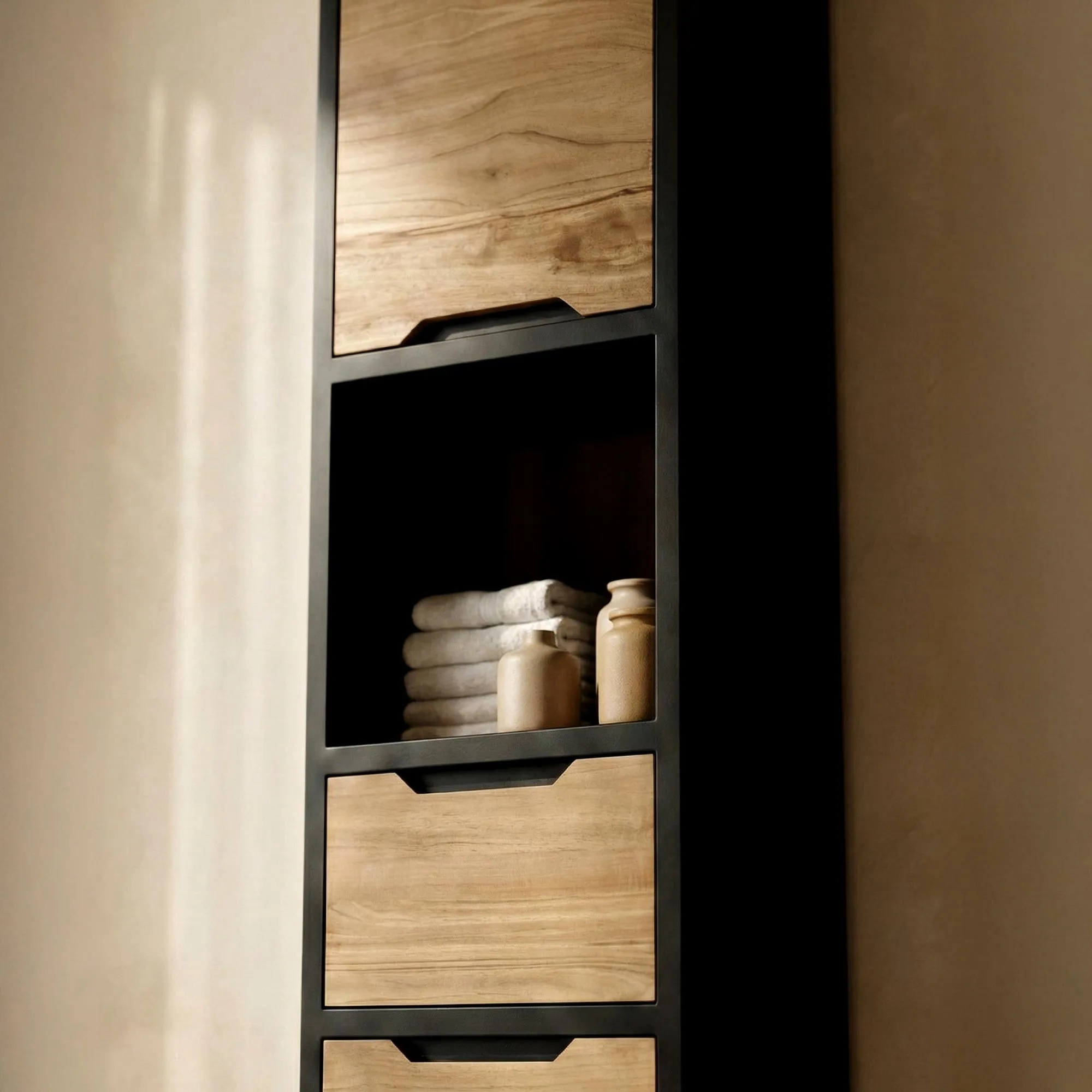 Diese Badezimmersäule ist Teil der Bold-Kollektion. Sie ist im Industriestil aus massivem Teakholz und Metall gefertigt und bietet viel Stauraum für Ihre Kosmetika, Handtücher und andere Badezimmeraccessoires. Sein zeitgenössischer Look wird einen bemerkenswerten Auftritt in einer modernen Einrichtung haben.