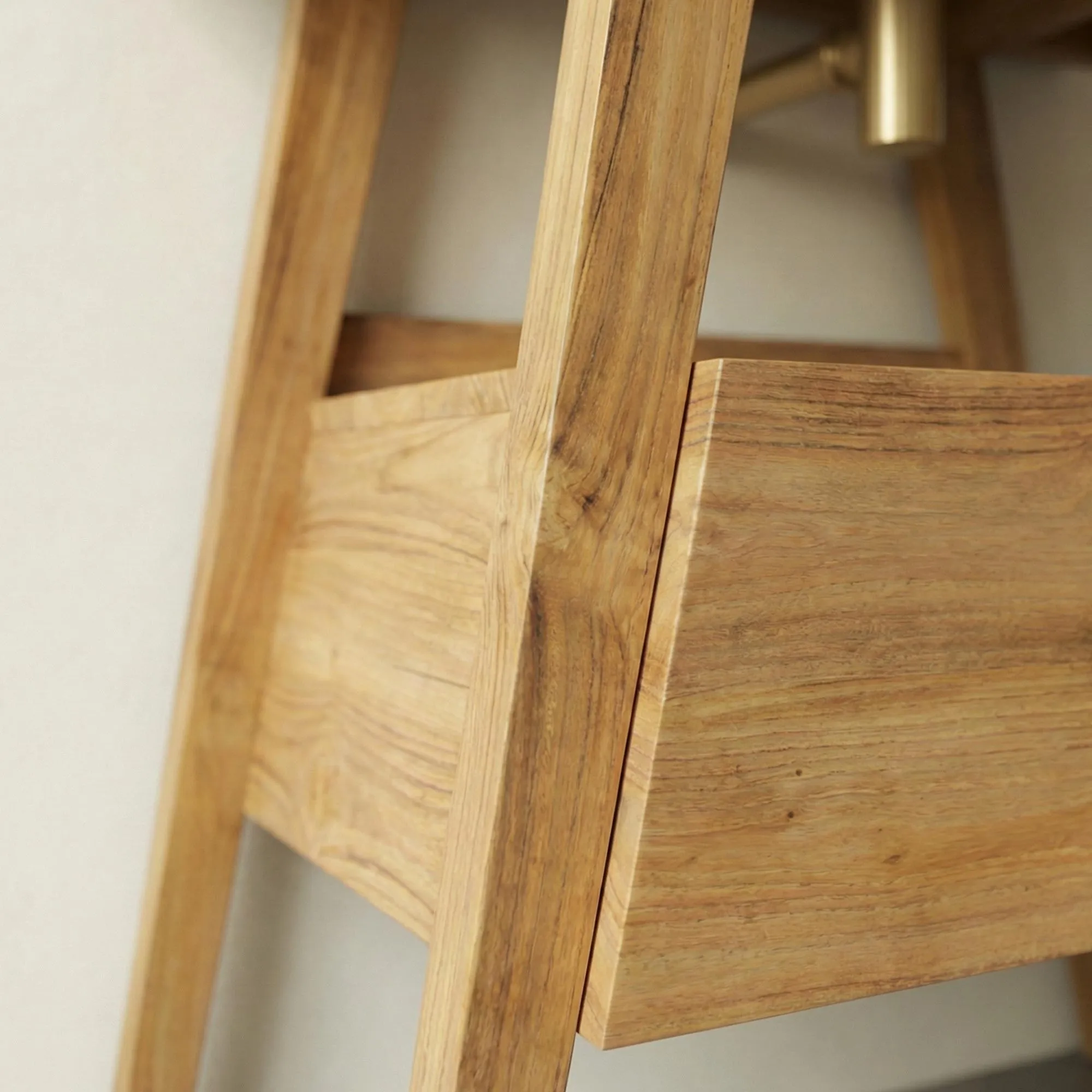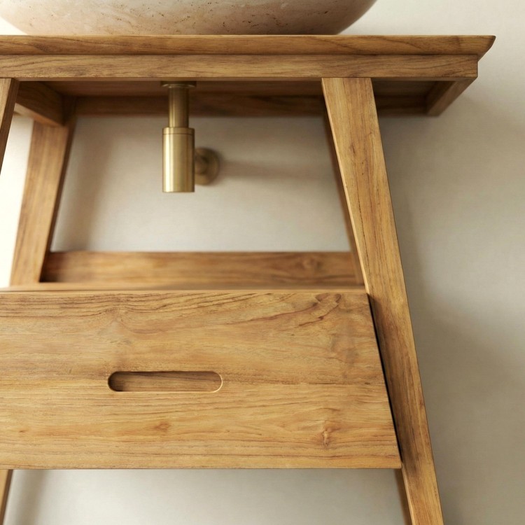 Sorgfältig aus massivem Teakholz gefertigt, verkörpert dieses Badezimmermöbel die natürliche Schönheit und Haltbarkeit von Tropenholz. Die Teakholz-Oberflächen betonen sein authentisches und elegantes Aussehen, während das einzigartige Design der trapezförmigen Beine dem Ganzen einen modernen und raffinierten Touch verleiht.