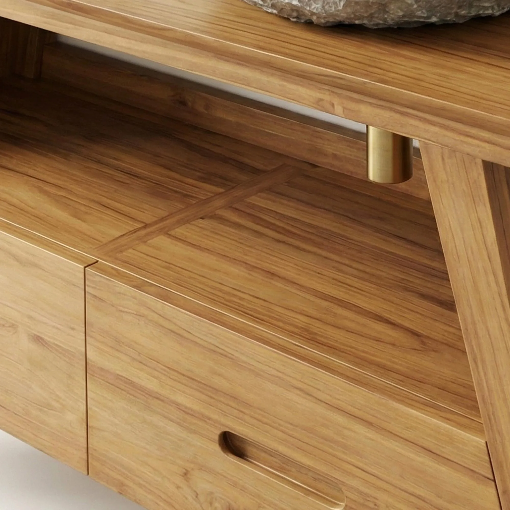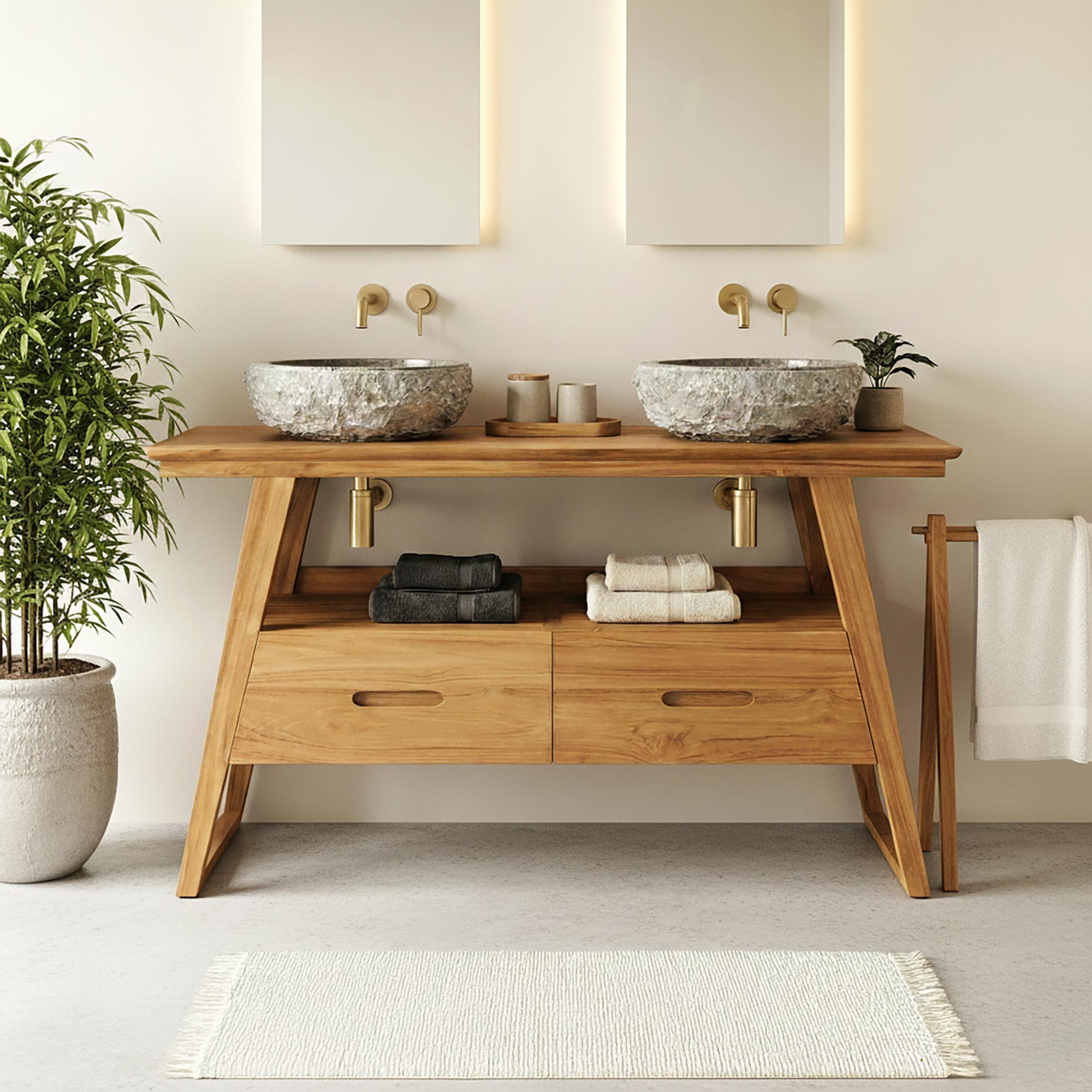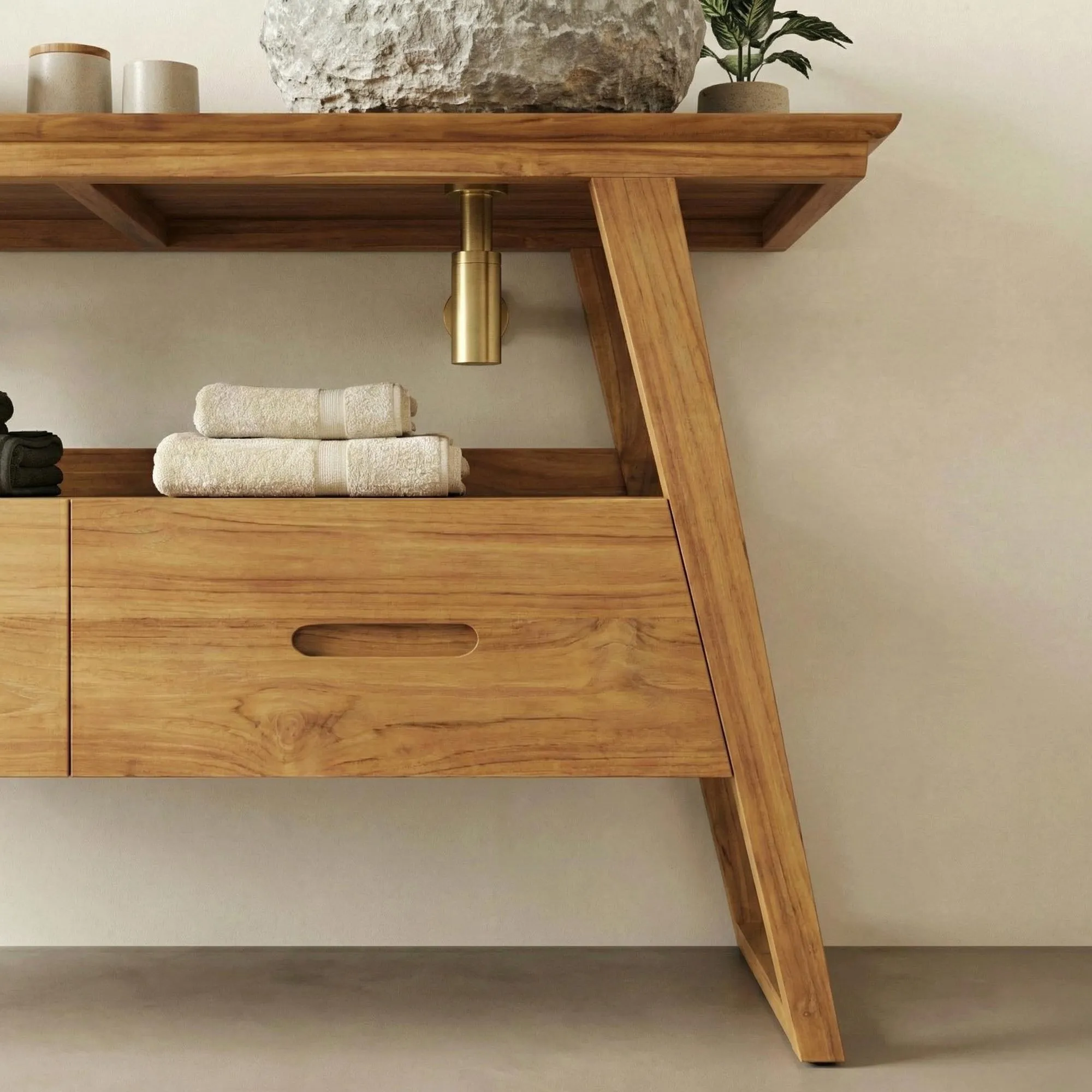 Sorgfältig aus massivem Teakholz gefertigt, verkörpert dieses Badezimmermöbel die natürliche Schönheit und bemerkenswerte Widerstandsfähigkeit von Tropenholz. Die Teakholz-Oberflächen betonen sein authentisches und elegantes Aussehen, während das einzigartige Design der trapezförmigen Beine dem Ganzen einen modernen und raffinierten Touch verleiht.