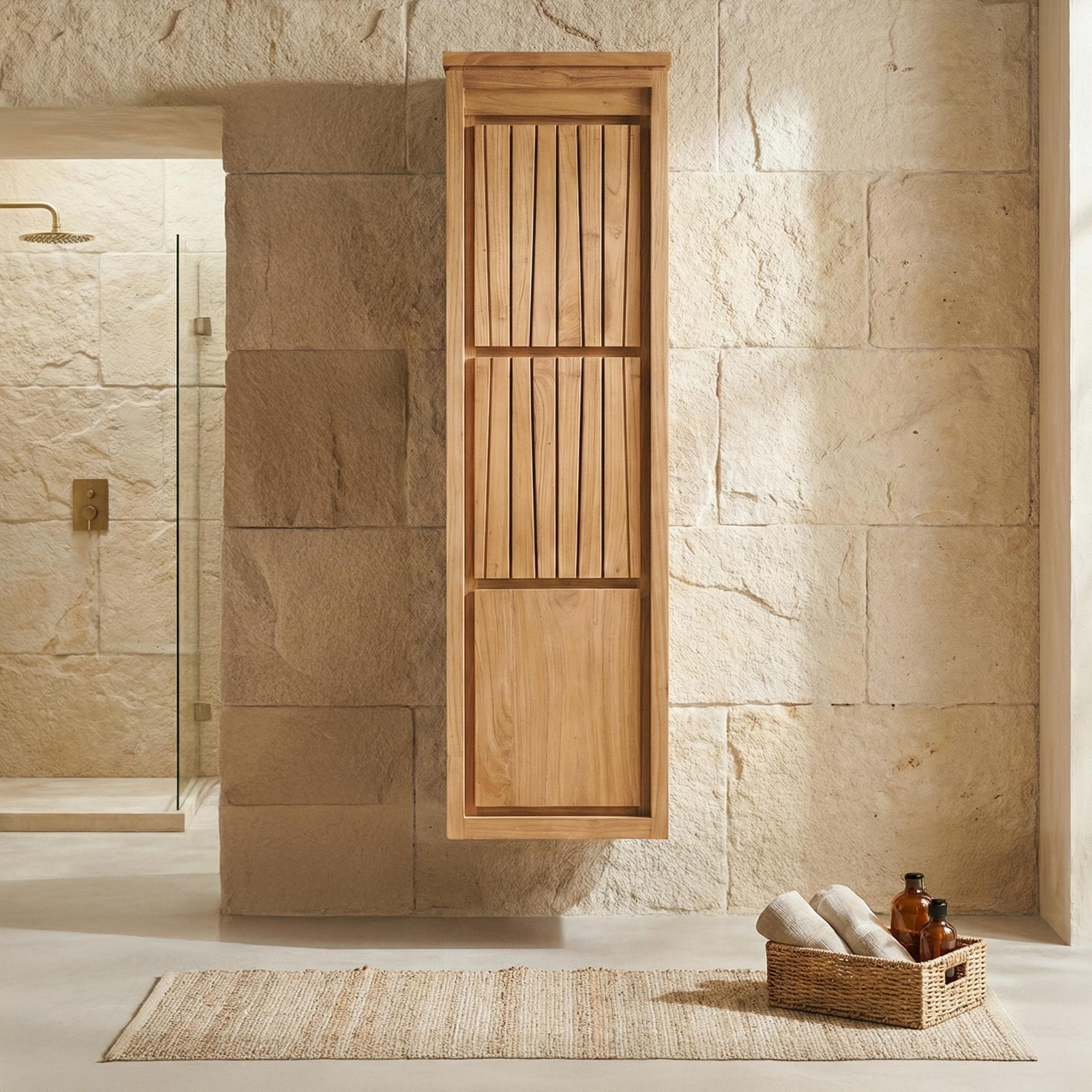 Holen Sie sich mit dieser hängenden Badezimmersäule aus der Neo-Kollektion Eleganz und Zweckmäßigkeit in Ihr Badezimmer. Die sorgfältig entworfene und aus massivem Mindi-Holz gefertigte Säule spiegelt eine einzigartige Handwerkskunst wider und verkörpert gleichzeitig ein zeitgenössisches, skandinavisch inspiriertes Design.