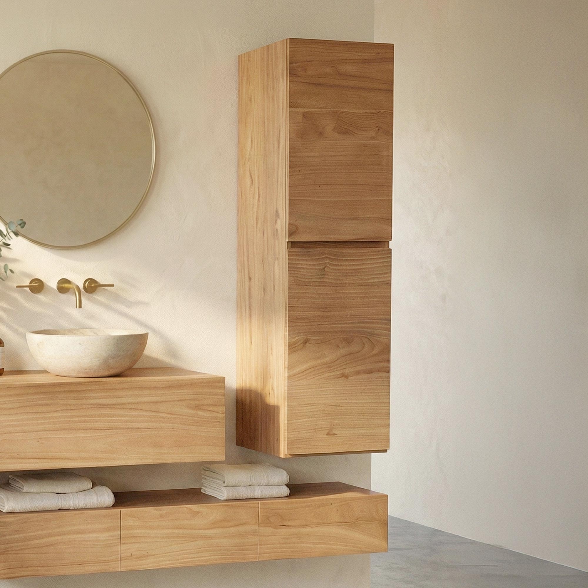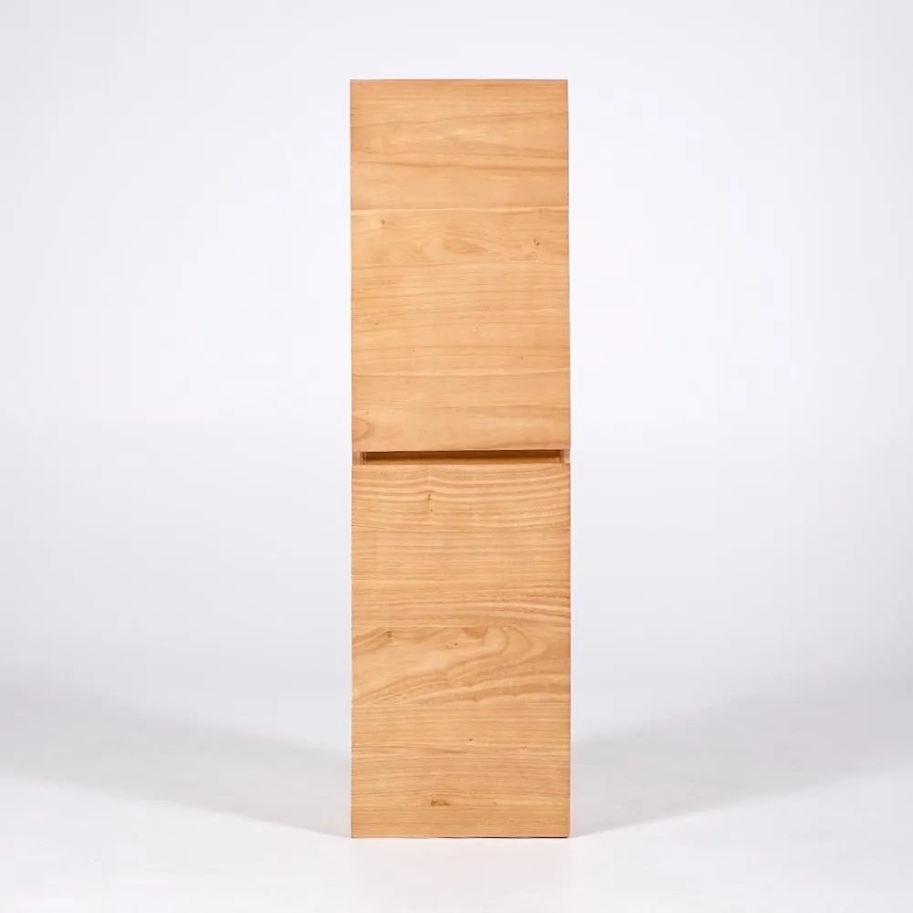 Entdecken Sie die Badezimmersäule aus der Trinity-Kollektion, ein Modell aus massivem Mindi-Holz, das Funktionalität und skandinavisches Design elegant miteinander verbindet. Dieses Hängemöbel bietet eine schlichte und zeitlose Silhouette, die perfekt ist, um das Ambiente Ihres Badezimmers aufzuwerten.