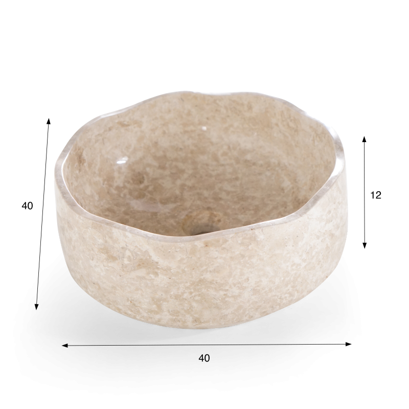 Das Innere des Beckens ist sorgfältig poliert und wasserabweisend behandelt, während die Außenseite ihren natürlichen und authentischen Charakter bewahrt. Dieses Waschbecken ist mit einer Ablauföffnung nach europäischen Normen ausgestattet, bereit für einen universellen Ablaufstopfen. Dank seines vielseitigen Designs lässt es sich harmonisch mit einem Badezimmermöbel, einer Platte oder einem Waschtisch kombinieren.