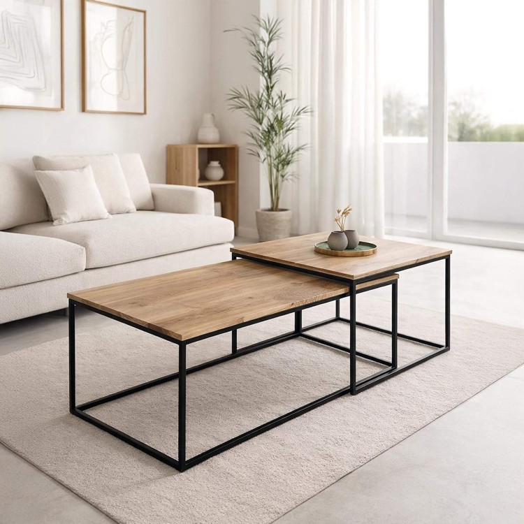 Wir haben diese Satztische mit Massivholzplatte und Metallstruktur so entworfen, dass sie unsere Sofakollektionen harmonisch ergänzen: Ihr sanft industrieller Stil bringt eine natürliche Kohärenz in den Raum und schafft ein ausgewogenes Gesamtbild, in dem jedes Element seinen Platz findet.