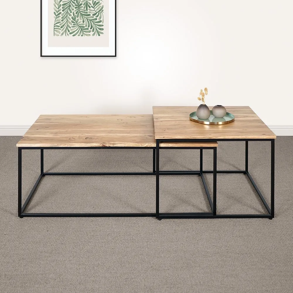 Unsere Designer haben diese Satztische mit Massivholzplatte und Metallgestell als eine elegante Möglichkeit entworfen, die Schlichtheit des industriellen Designs mit der Wärme eines authentischen Materials zu verbinden. Durch die Verarbeitung von massivem Akazienholz, einem wegen seiner natürlichen Farbnuancen und Robustheit geschätzten Holz, wollten wir ein vielseitiges, luftiges Duo schaffen, das sowohl in modernen Wohnräumen als auch in gemütlicheren Interieurs seinen Platz findet.