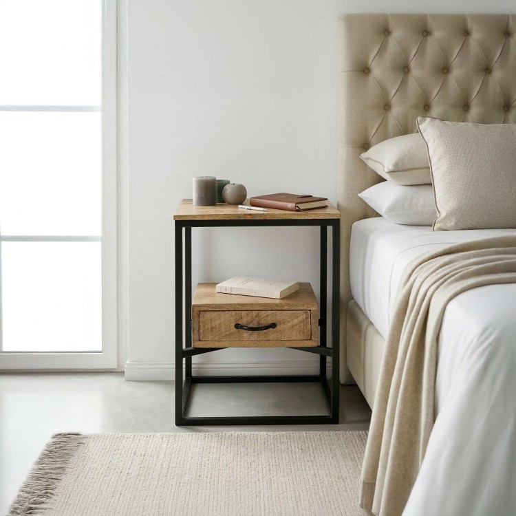 Dieser Nachttisch aus Naturholz zeichnet sich durch ein klares und funktionales Design aus, das vom Industriestil inspiriert ist, der aufgrund seiner Fähigkeit, moderne Ästhetik mit Robustheit zu verbinden, sehr beliebt ist. Er ist aus massivem Mangoholz gefertigt, einem Material, das für seine Langlebigkeit und seine schöne natürliche Maserung bekannt ist und jedem Wohnraum einen Hauch von Wärme und Authentizität verleiht.