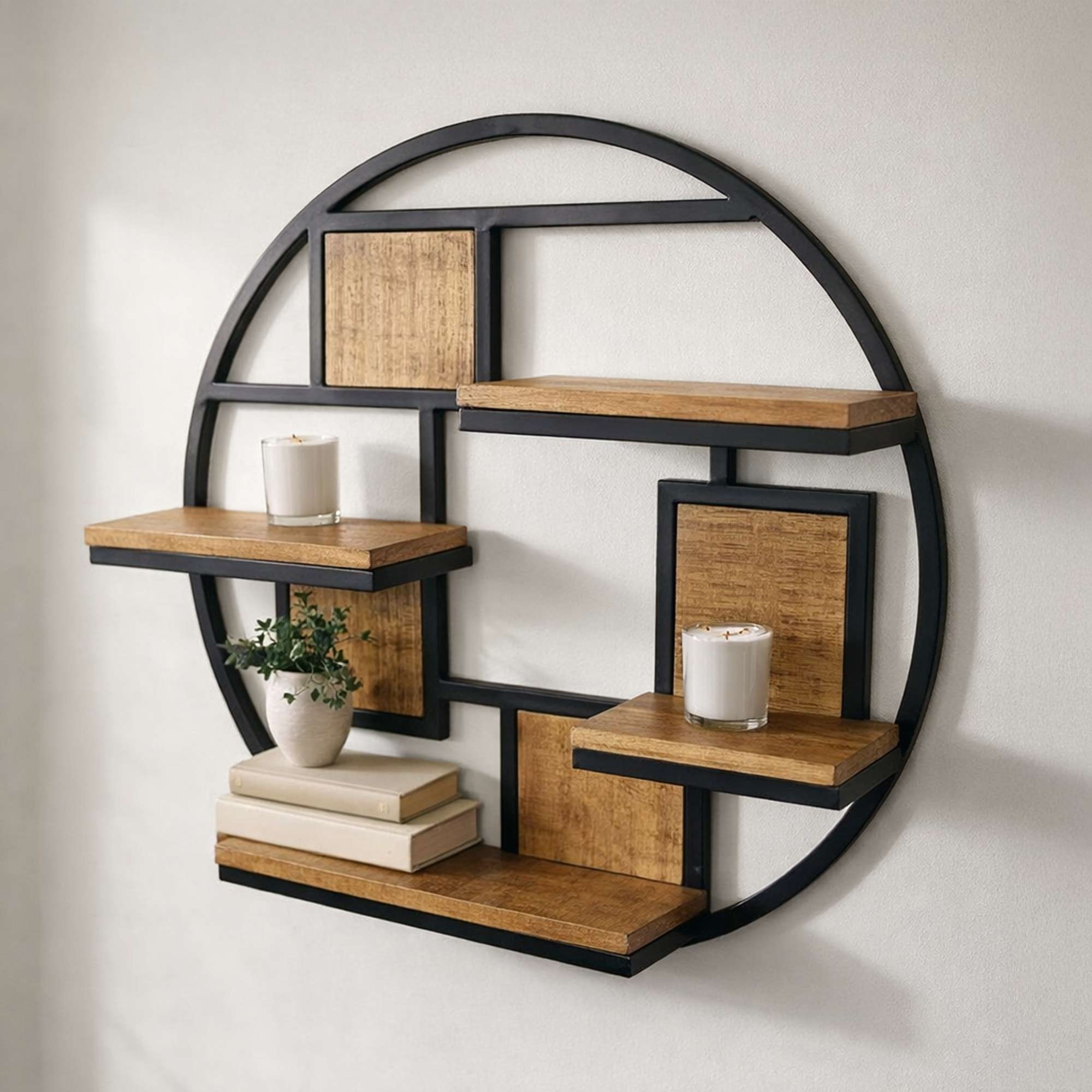 Die Mischung aus Industriemetall und warmem Holz macht dieses runde Regal zu einer vielseitigen Ergänzung für jede Einrichtung. Ob im Eingangsbereich für Schlüssel und Post, im Wohnzimmer für Kunstgegenstände oder sogar in der Küche für Gewürze und Kräuter - das Regal passt sich jedem Kontext an und verleiht ihm seinen eigenen Hauch funktionaler Eleganz.