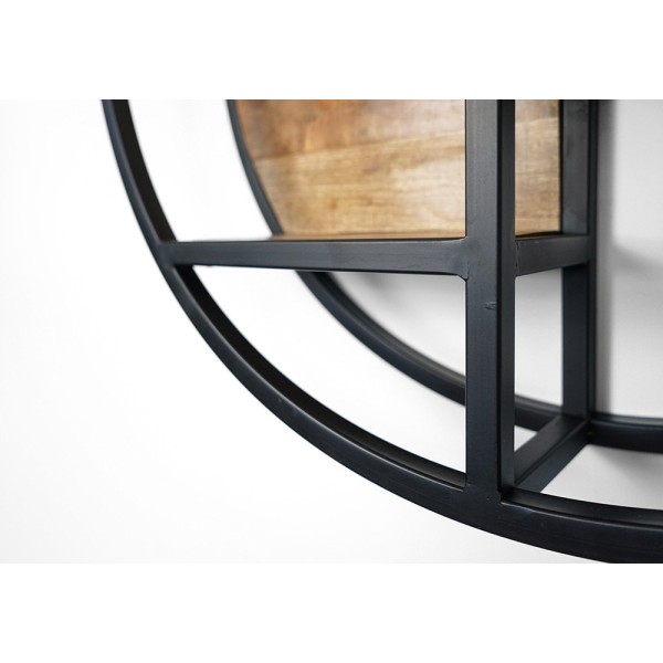 Dieses runde Industrieregal aus Metall und Massivholz ist ein Designerstück, das Innovation mit Tradition verbindet und in jedem Wohnraum eine auffallende Wirkung erzielt. Sein doppelter, kreisförmiger, schwarz lackierter Metallrahmen sorgt für einen modernen Touch und einen grafischen Kontrast, der die natürliche Schönheit der sich darin einbettenden Massivholzregale hervorhebt.