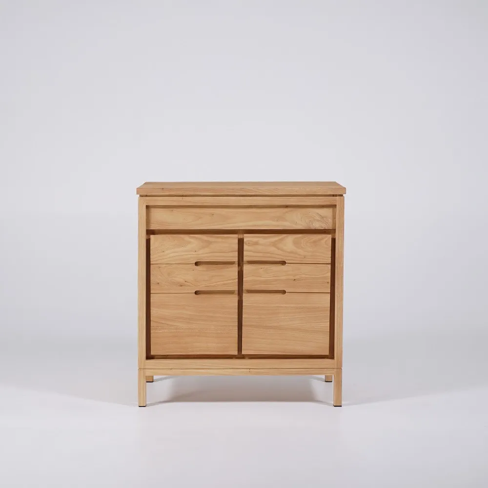 Die klaren Linien und die dezent integrierten Griffe unterstreichen das moderne, schlichte skandinavische Design. Die Beine aus Massivholz sorgen für eine sichere Stabilität und eine optische Leichtigkeit, die Ihren Raum schmückt. Das natürliche Finish hebt die einzigartige Maserung des Holzes hervor und verleiht jedem Möbelstück einen eigenen Charakter.