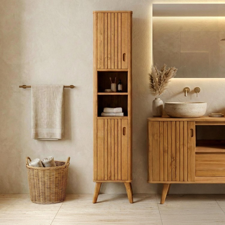 Holen Sie sich mit der Aufbewahrungssäule aus Massivholz aus der Neha-Kollektion einen Hauch von skandinavischer Raffinesse in Ihr Badezimmer. Diese elegant gestaltete Säule aus Teakholz zeichnet sich durch ihre klaren Linien und ihr natürliches Finish aus, das die Schönheit des Holzes hervorhebt. Sie wurde für eine optimale Aufbewahrung konzipiert und verfügt über zwei geschlossene Fächer und offene Nischen, die eine einfache Organisation der wichtigsten Dinge im Badezimmer ermöglichen, während die Dinge des täglichen Bedarfs stets griffbereit sind.