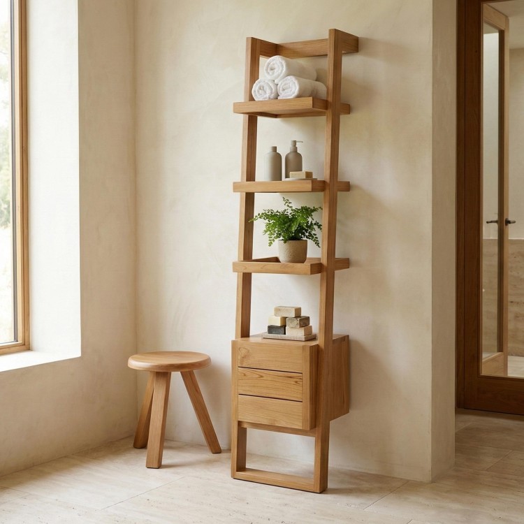 Die glatte Textur des Teakholzes und die sorgfältige Verarbeitung verleihen diesem Möbelstück ein zeitloses Aussehen und machen es anpassungsfähig an verschiedene Einrichtungsstile. Ob in einem modernen Badezimmer oder in einem Raum mit einem eher natürlichen Charme, diese Säule fügt sich perfekt ein, um einen Hauch von Authentizität und Funktionalität hinzuzufügen.