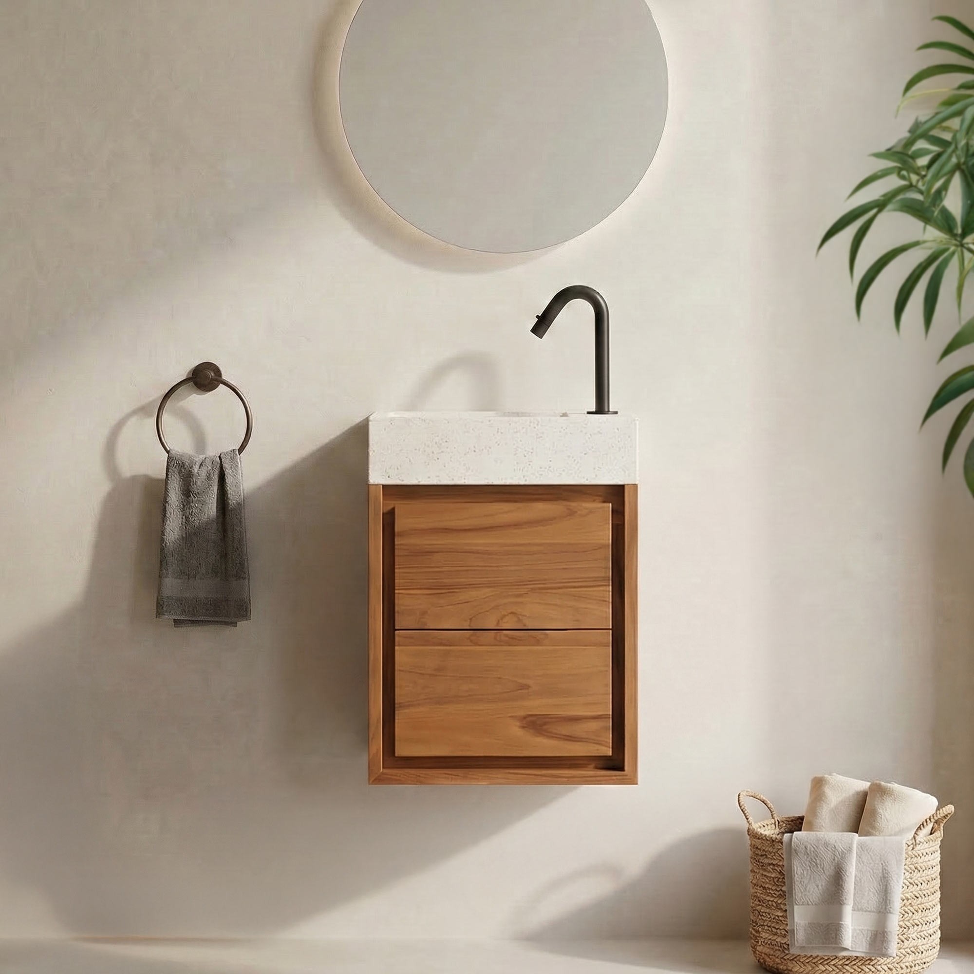 Hängender Handwaschbeckenunterschrank aus massivem Teakholz und weißem Terrazzowaschbecken - Tanvi