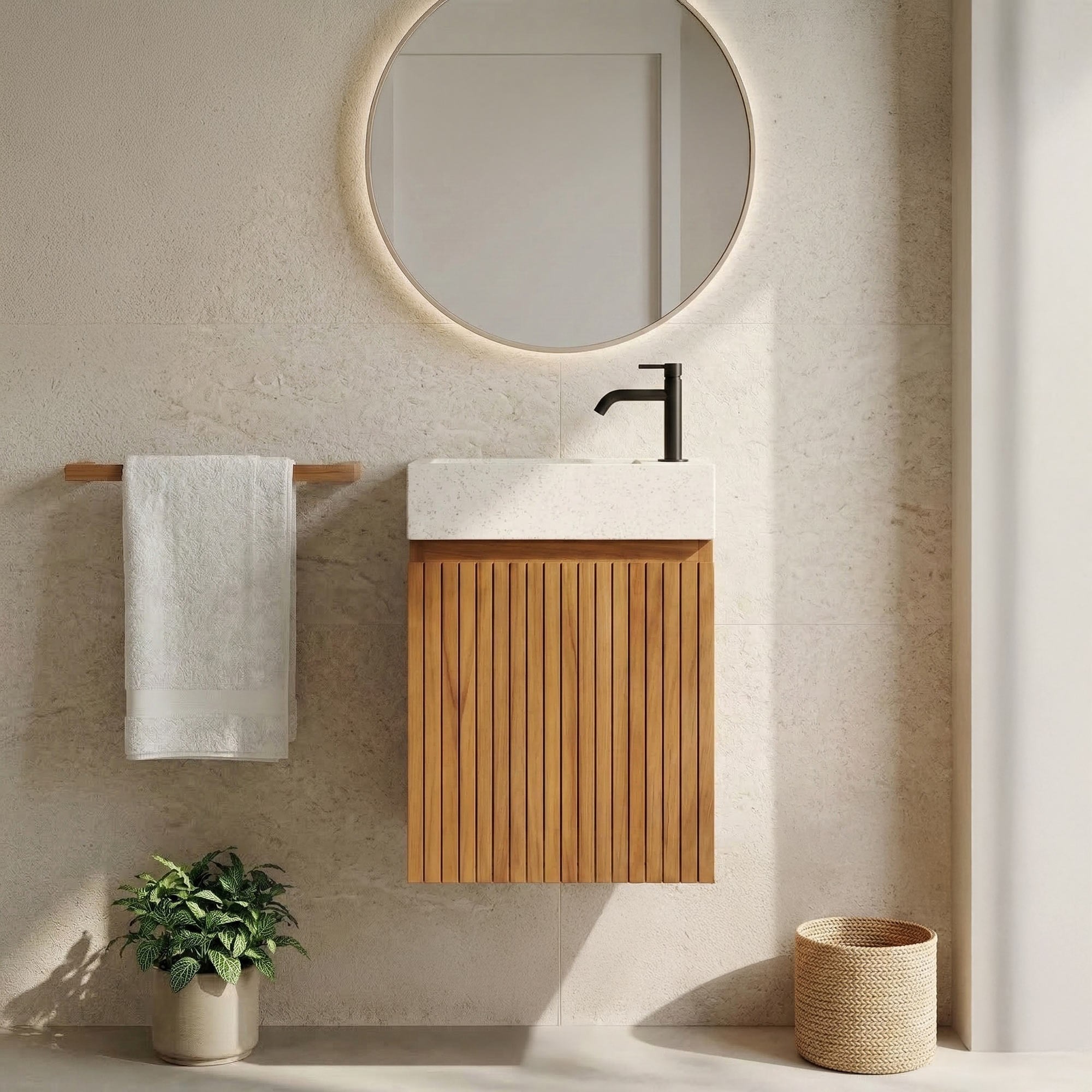 Das Handwaschbecken-Möbel Trishna kombiniert Minimalismus und Raffinesse, indem es die Codes des skandinavischen Designs neu interpretiert. Es hängt, um den Raum zu maximieren und die visuelle Leichtigkeit zu betonen, und ist aus massivem Teakholz gefertigt, einem Material, das für seine Langlebigkeit und natürliche Ästhetik bekannt ist. Seine Schwingtür mit vertikalen Rillen enthüllt ein praktisches 40 x 40 cm großes Fach, mit dem Sie Ihren Stauraum in einem kompakten Badezimmer optimieren können.