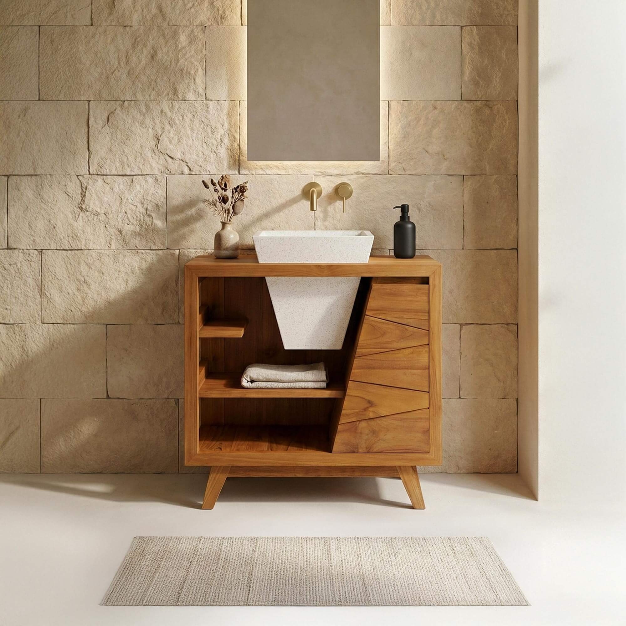 Meera Badezimmermöbel aus massivem Teakholz und Waschbecken aus weißem Terazzo - Meera