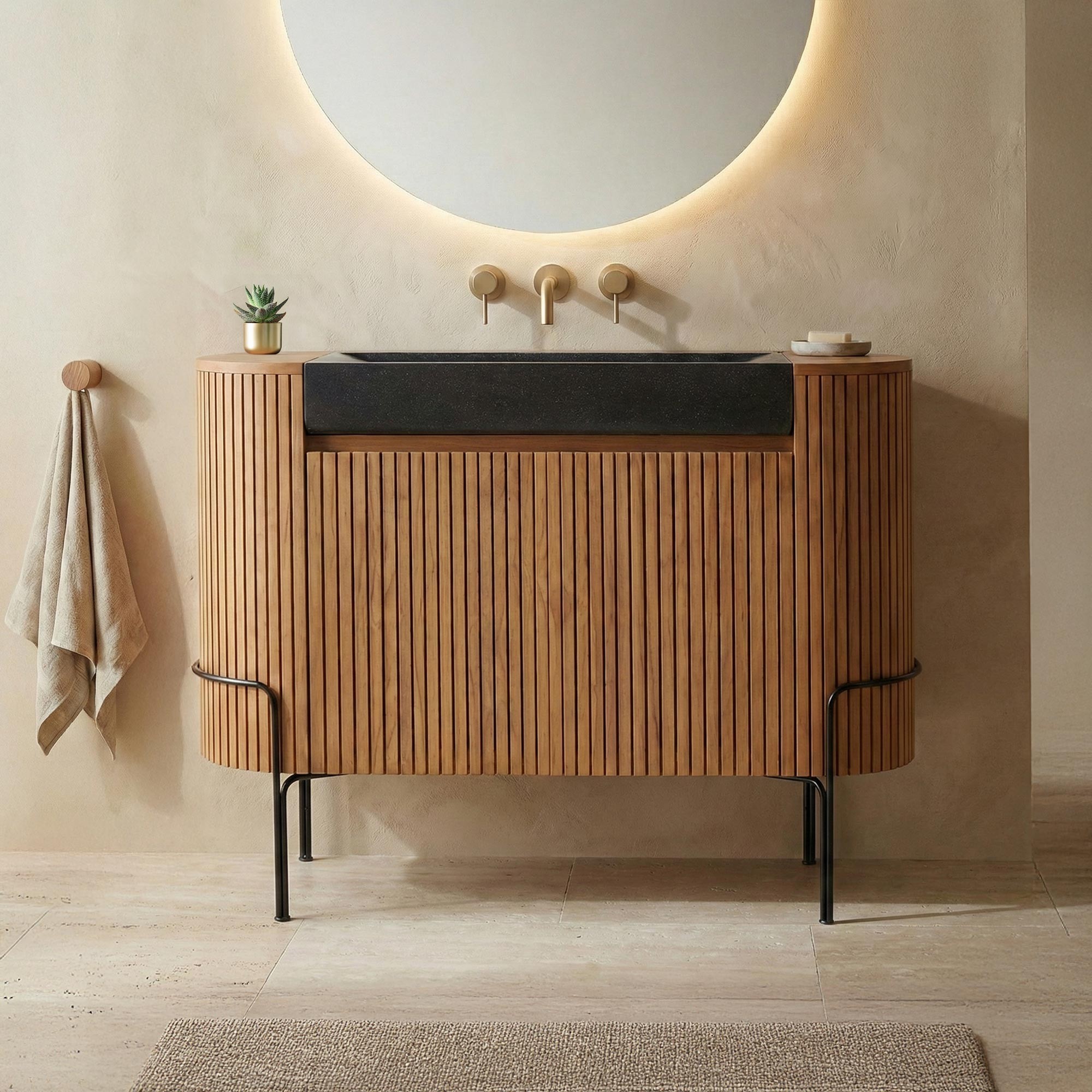 Veredeln Sie Ihr Badezimmer mit dem Badezimmermöbel Rani, einem außergewöhnlichen Stück, das Handwerkskunst, skandinavisches Design und edle Materialien miteinander verbindet. Das aus massivem Teakholz gefertigte Möbelstück verkörpert die perfekte Begegnung von Robustheit und natürlicher Eleganz. Die makellose Verarbeitung hebt den Nuancenreichtum des Teakholzes hervor, während die klaren Linien und die detaillierten Rillen sein modernes Aussehen unterstreichen.
