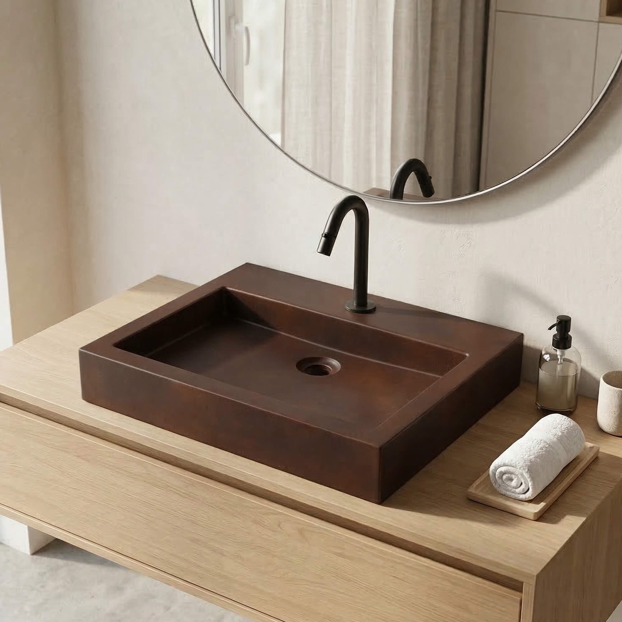 Das elegante und warme Vintage-Braun des aus Beton hergestellten Waschbeckens verleiht ihm Charakter und fügt sich harmonisch in eine moderne oder industrielle Einrichtung ein.