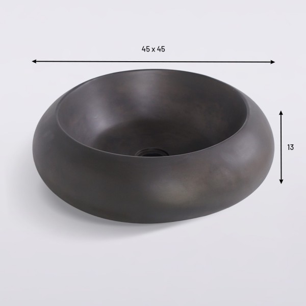 Jedes Waschbecken ist mit absoluter Liebe zum Detail handgeschnitzt und weist eine makellose Verarbeitung und eine glatte Textur auf, die die Noblesse des Betons unterstreicht. Dieses schicke, rohe Material verleiht dem Raum eine bemerkenswerte Festigkeit und verleiht ihm gleichzeitig eine raffinierte Note. Die großzügigen Abmessungen mit einem Durchmesser von 45 cm und einer Höhe von 13 cm sorgen für eine bequeme Nutzung im Alltag und halten Spritzer effektiv in Grenzen.