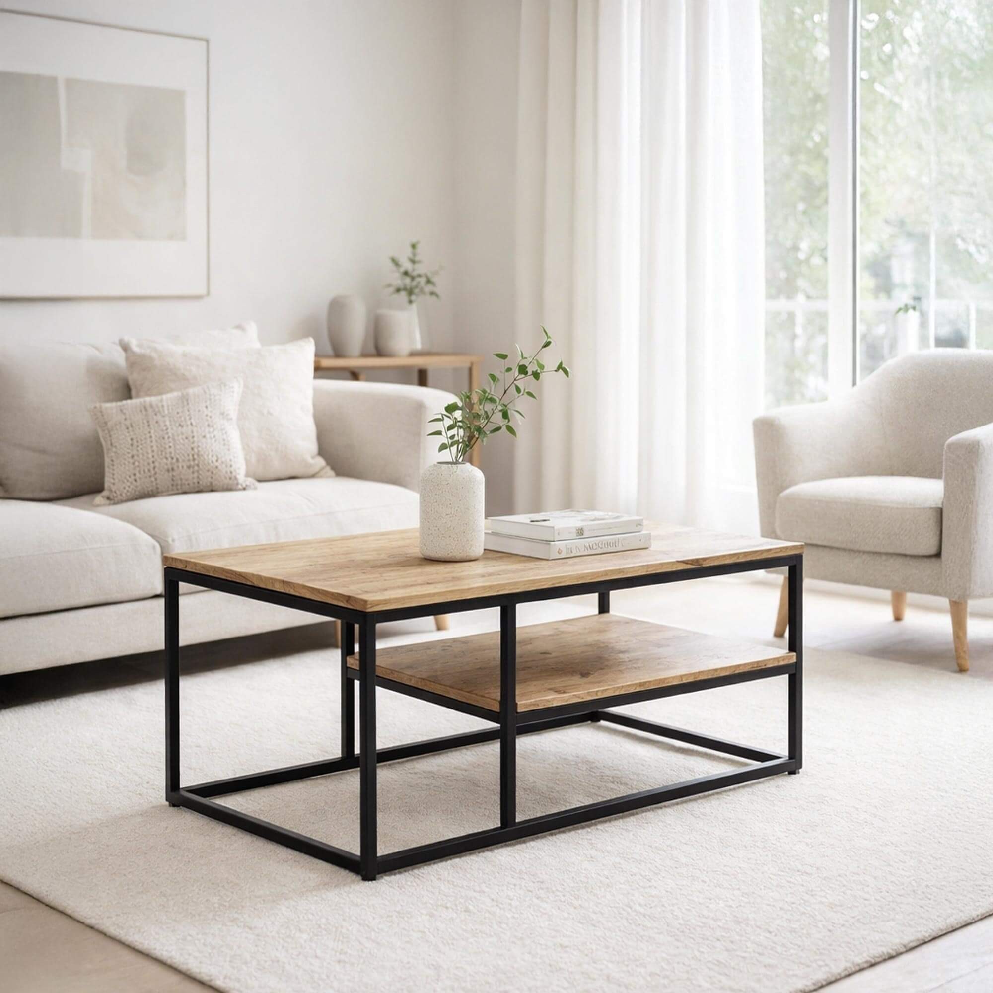 /279-industrial-couchtischeBringen Sie mit diesem Couchtisch aus massivem Mangoholz einen Hauch von Eleganz und Robustheit in Ihr Wohnzimmer. Als echtes Stück Handwerkskunst verbindet er harmonisch den natürlichen Charme des Holzes mit der Modernität des Metalls und schafft so ein Möbelstück mit zeitlosem Industriedesign. Sein zweistufiges Design bietet einen praktischen und durchdachten Raum, um Ihre dekorativen Gegenstände auszustellen oder Ihre täglichen Essentials zu verstauen.