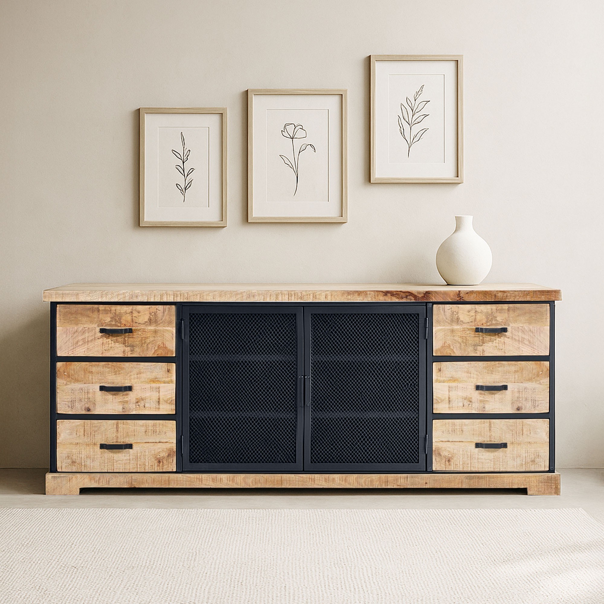 Dieses Sideboard wird bereits montiert geliefert, sodass Sie es garantiert sofort und einfach in Ihrem Wohnbereich aufstellen können. In Handarbeit gefertigt, wurde jedes Detail durchdacht, um ein elegantes und gleichzeitig robustes Möbelstück zu schaffen, das vom rohen Charme des Industriestils inspiriert ist. Die natürlichen Oberflächen des Mangoholzes sorgen zusammen mit dem matten, schwarzen Metall für ein perfektes Gleichgewicht zwischen Tradition und Moderne.