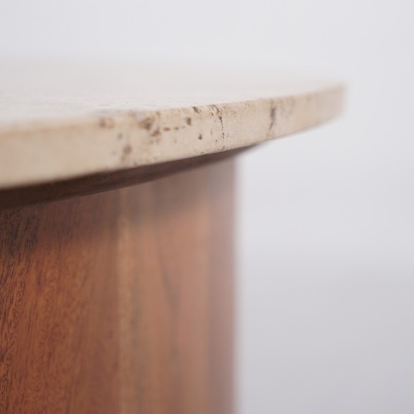 Handgefertigt weist jeder Design-Couchtisch aus Massivholz mit Travertin-Marmorplatte einzigartige Holz- und Steinnuancen auf, typisch für unsere Kreationen. Der Travertin, ausgewählt wegen seiner Textur und seines authentischen Charmes, verstärkt den Eindruck eines lebendigen Stücks, das eher von der Materie als vom Handgriff geformt ist.
