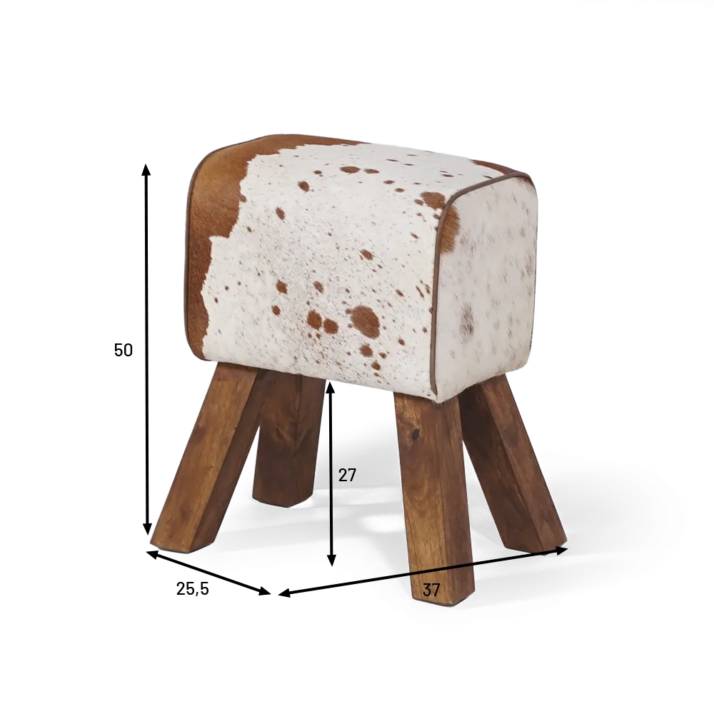 Inspiriert von der Welt des Westerns interpretiert diese kleine Bank aus Kuhfell und Massivholz das Pauschenpferd auf elegante Weise neu. Ihre rechteckige, großzügig gepolsterte Sitzfläche, die mit echtem Fell mit einzigartigen Mustern bezogen ist, verleiht jedem Stück einen einzigartigen und authentischen Charakter. Der Kontrast zwischen dem weichen Material und den robusten Beinen aus Massivholz betont sein rustikales und zugleich anspruchsvolles Aussehen.