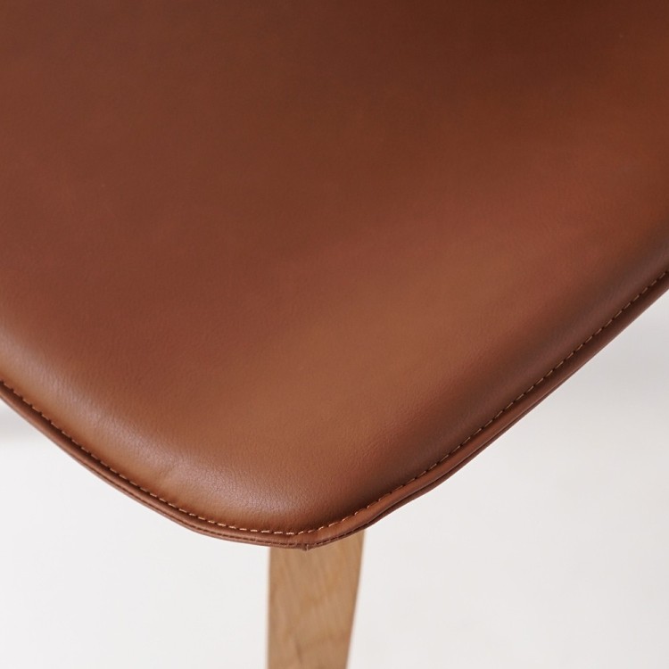 Die ergonomisch geformte, leicht geschwungene Sitzfläche bietet optimalen Komfort und ist ideal für lange, gesellige Stunden am Esstisch. Der weiche Griff des braunen Kunstleders, das durch diskrete und präzise Nähte hervorgehoben wird, verleiht dem Stuhl eine subtile Raffinesse und ist gleichzeitig pflegeleicht.