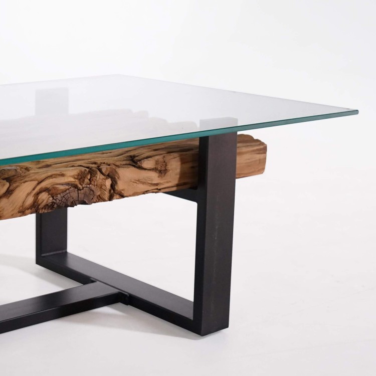 Die schwarze Metallstruktur unseres Couchtisches aus Glas und Eisenbahnschwellen Railwood ist robust und geometrisch und bildet einen spannenden Kontrast zur organischen Textur des Holzes. Dieses Gleichgewicht zwischen Stärke und Leichtigkeit schafft ein zeitloses Designobjekt, das sowohl in einem industriellen Loft als auch in einem puristischen Interieur seinen Platz findet. Das klare, offene Gestell lässt den Blick unter die Tischplatte gleiten und verstärkt so das Gefühl von Raum und Leichtigkeit.