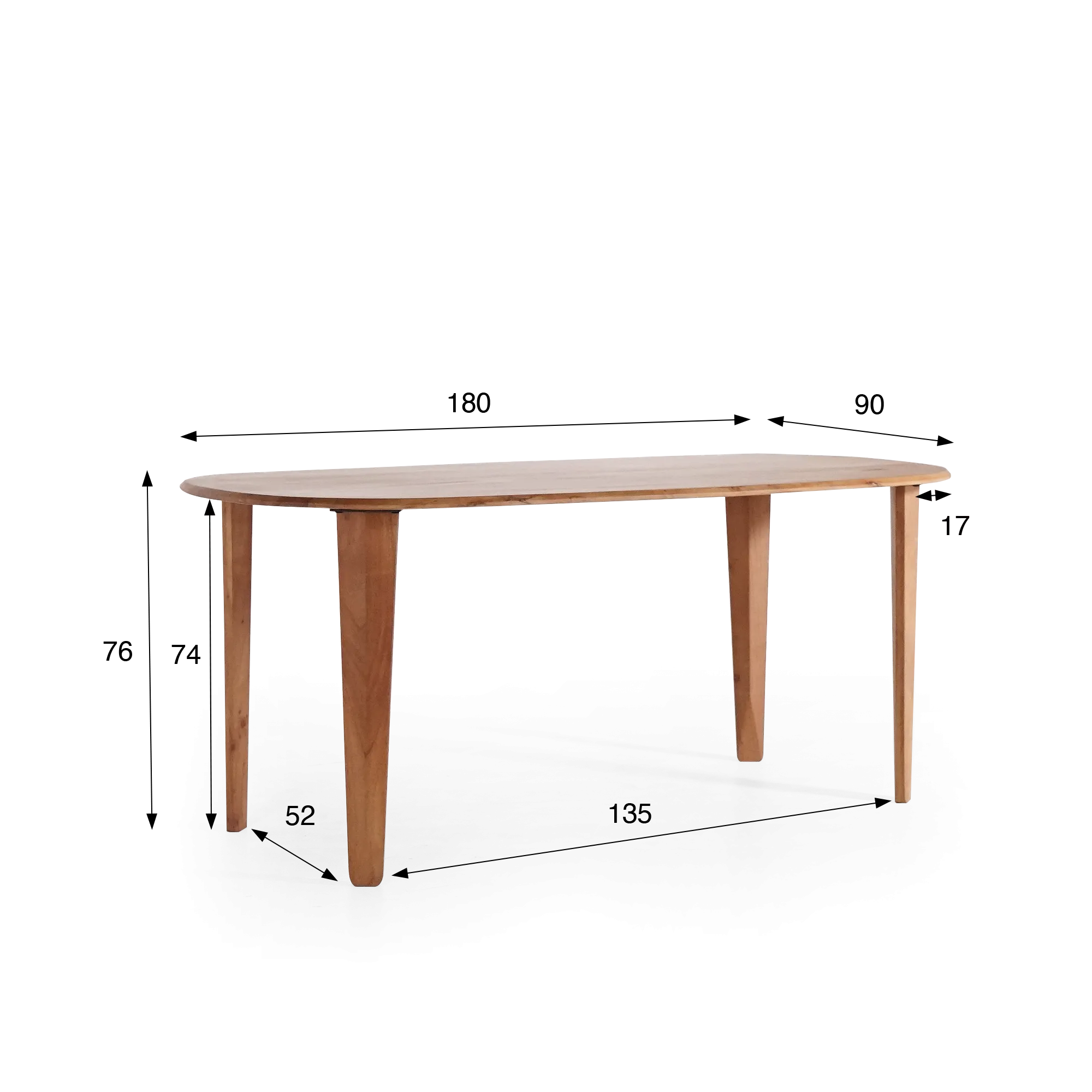 Mit einer Höhe von 76 cm bietet dieser ovale Esstisch aus massivem Mangoholz ideale Ergonomie – sowohl für den Alltag als auch für gesellige Momente. Die ovale Form fördert den Bewegungsfluss und schafft eine intime Atmosphäre, in der jeder seinen Platz rund um den Tisch findet.
