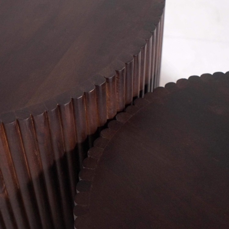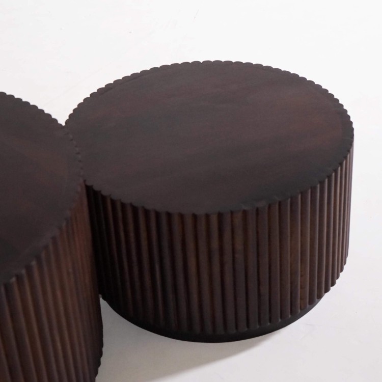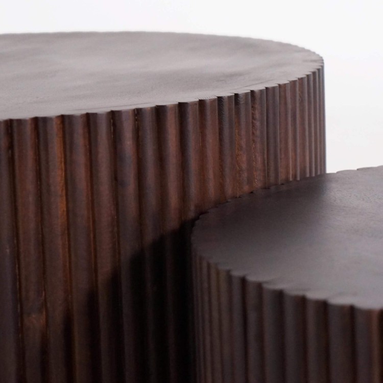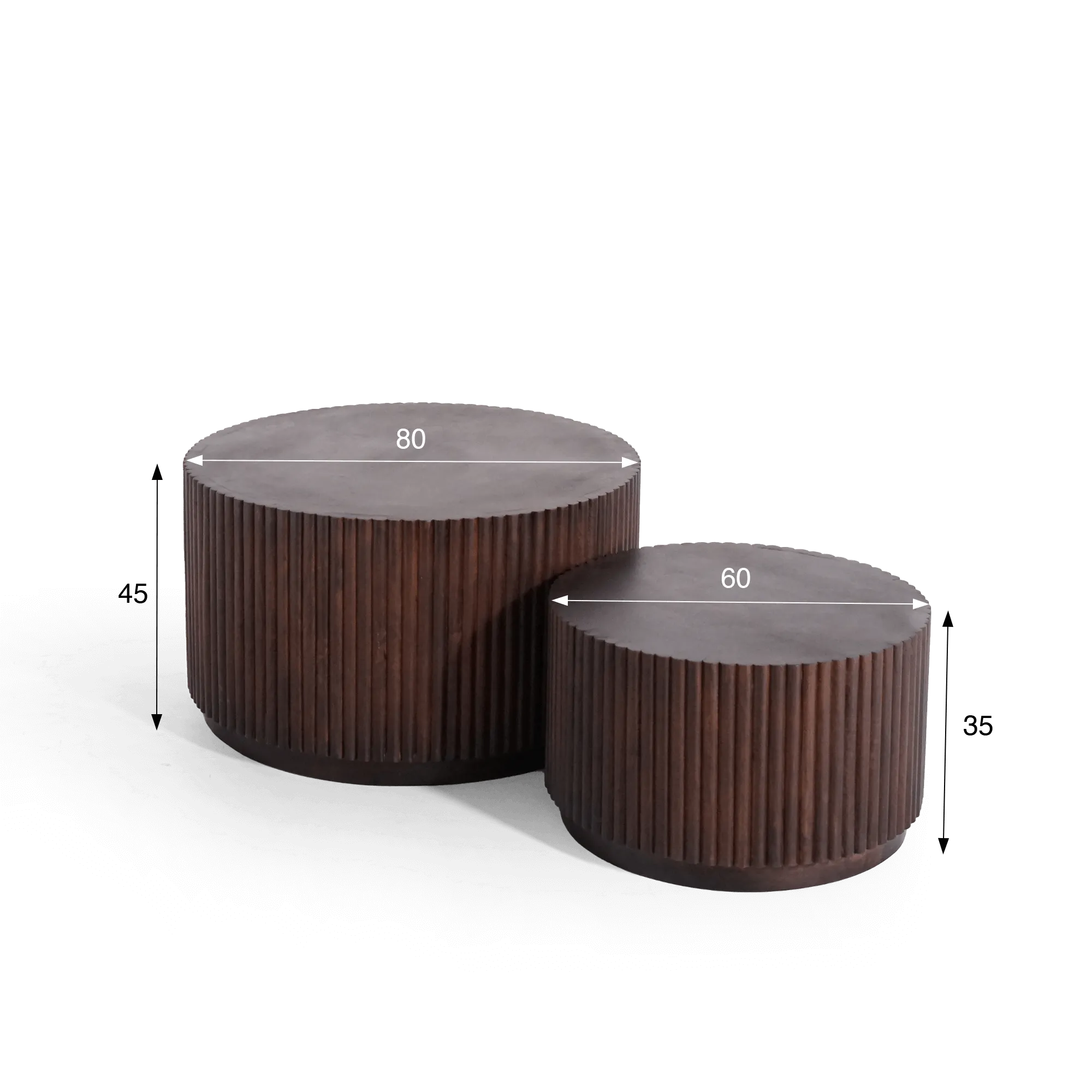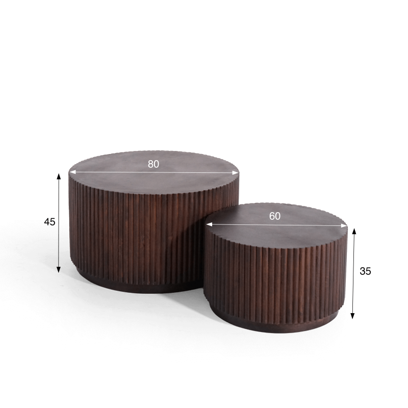 Gefertigt aus Mangoholz besticht dieses Set aus 2 runden Design-Couchtischen aus Massivholz durch seine elegante dunkelbraune Oberfläche und die gerillte Struktur, die subtil mit dem Licht spielt. Der größere Tisch mit einem Durchmesser von 80 cm und einer Höhe von 45 cm wird von einer niedrigeren Version mit 60 cm Durchmesser und 35 cm Höhe ergänzt. Zusammen bilden sie ein harmonisches Gleichgewicht aus Volumen und Proportionen und schaffen einen natürlichen Blickfang im Wohnzimmer.