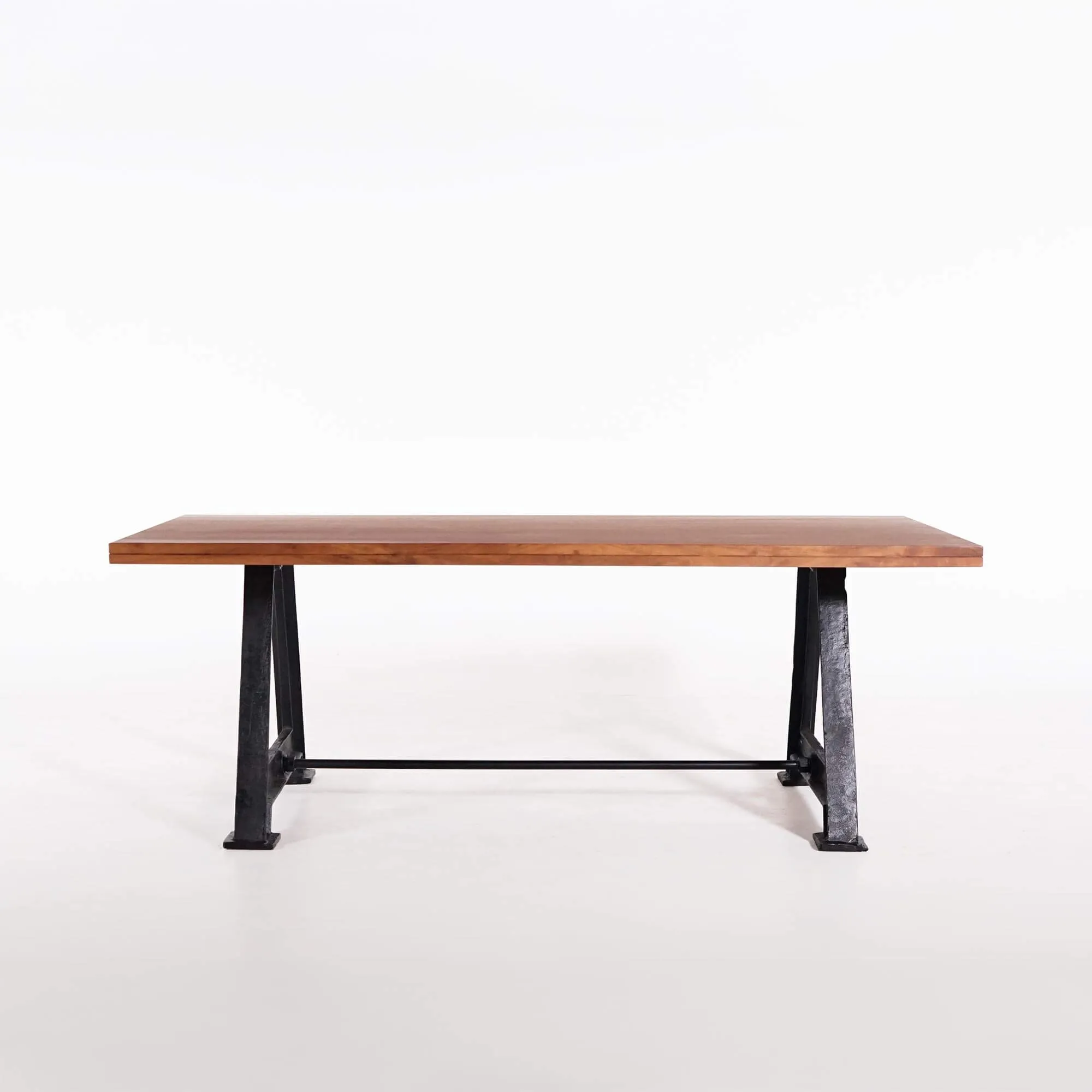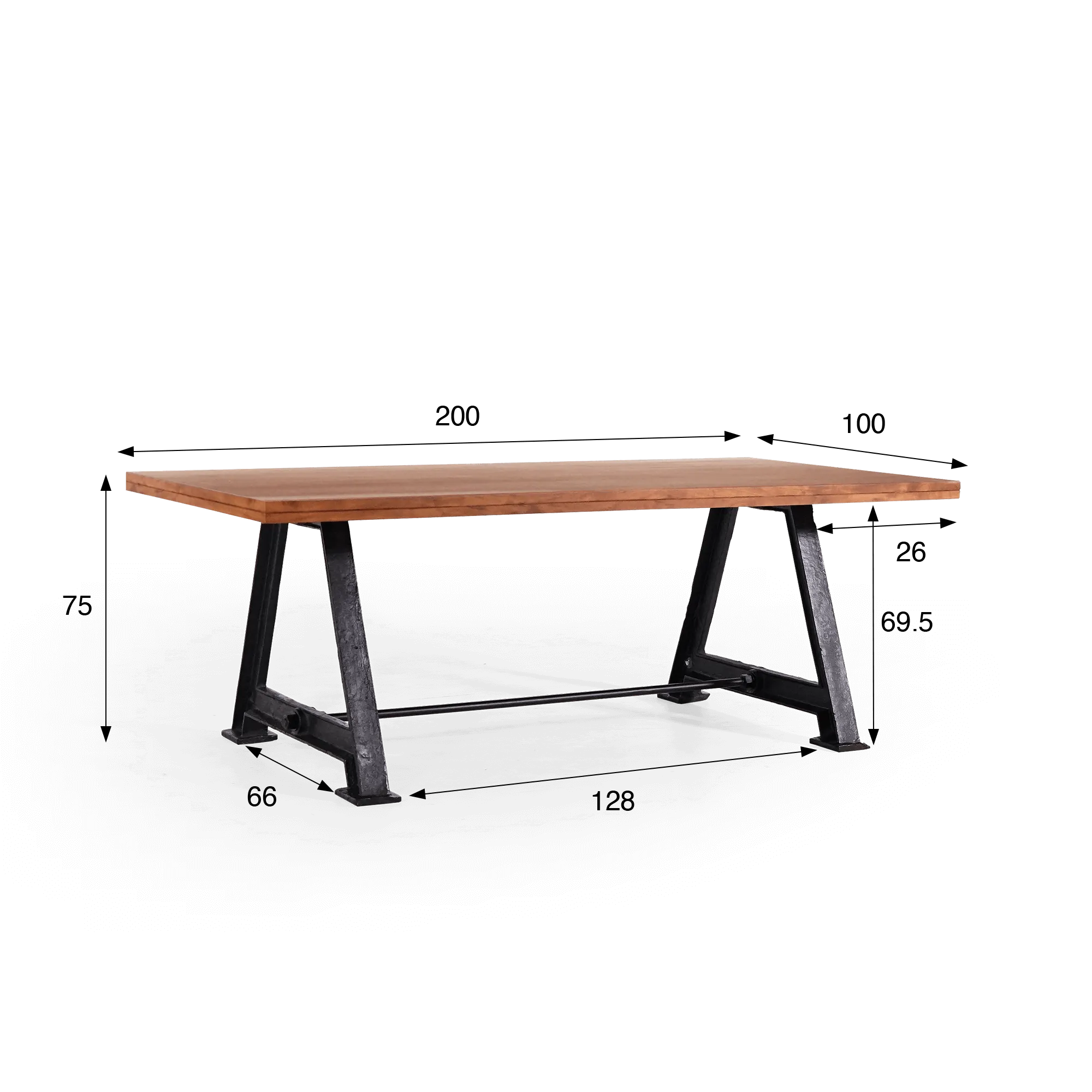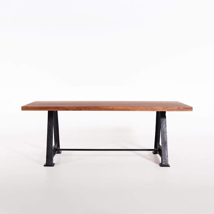 Das Gestell aus schwarzem Gusseisen dieses Esstisches im Industriestil, inspiriert von industriellen Metallstrukturen, verleiht dem Ensemble eine bemerkenswerte Stabilität. Seine schrägen Linien und die zentrale Verstrebung unterstreichen ein Design, das sowohl funktional als auch grafisch ist – geschaffen, um die Zeit zu überdauern, ohne an Modernität zu verlieren. Der Kontrast zwischen der Wärme des Holzes und der Kühle des schwarzen Metalls schafft ein starkes ästhetisches Gleichgewicht, ganz im Sinne des industriellen Charakters unserer wichtigsten Kollektionen.