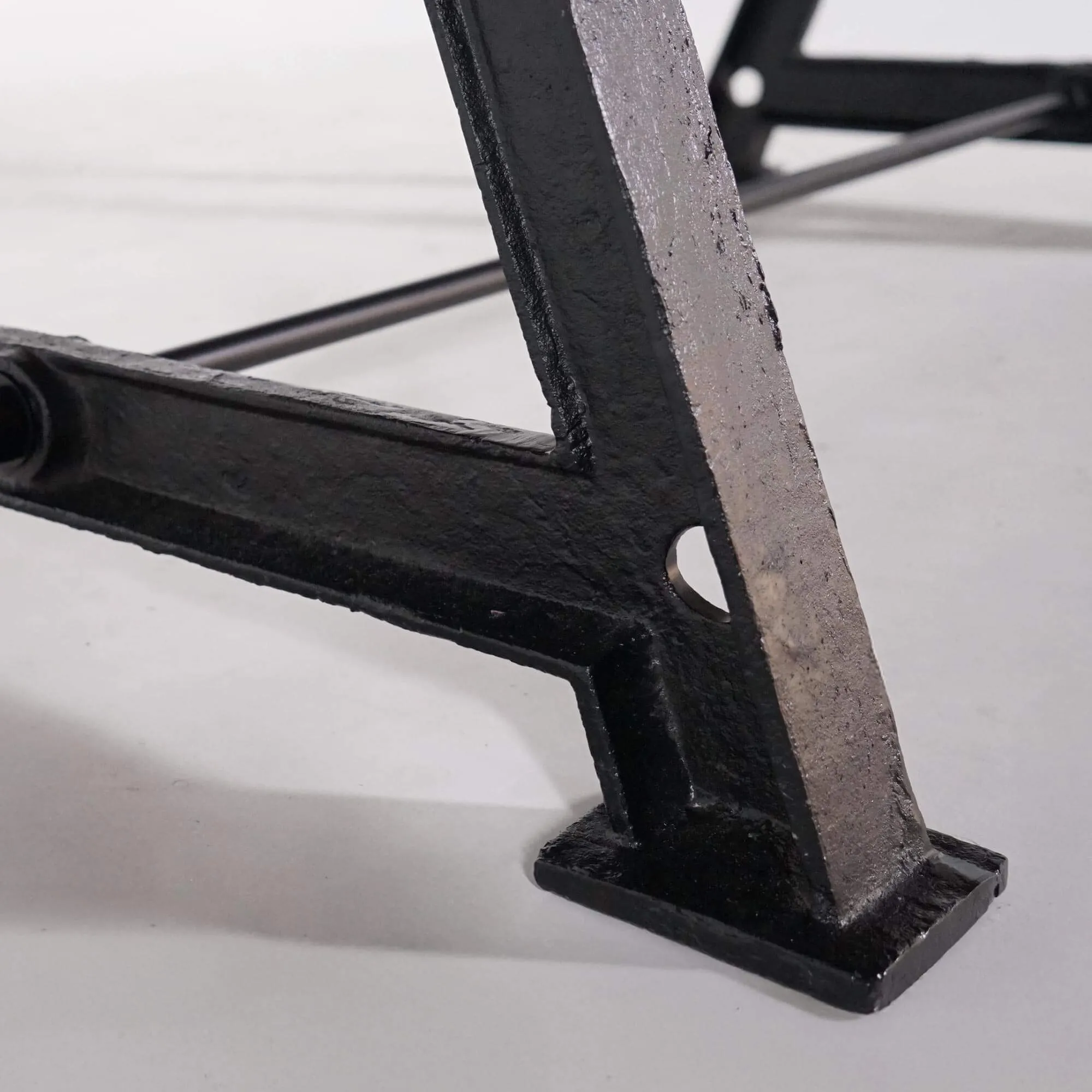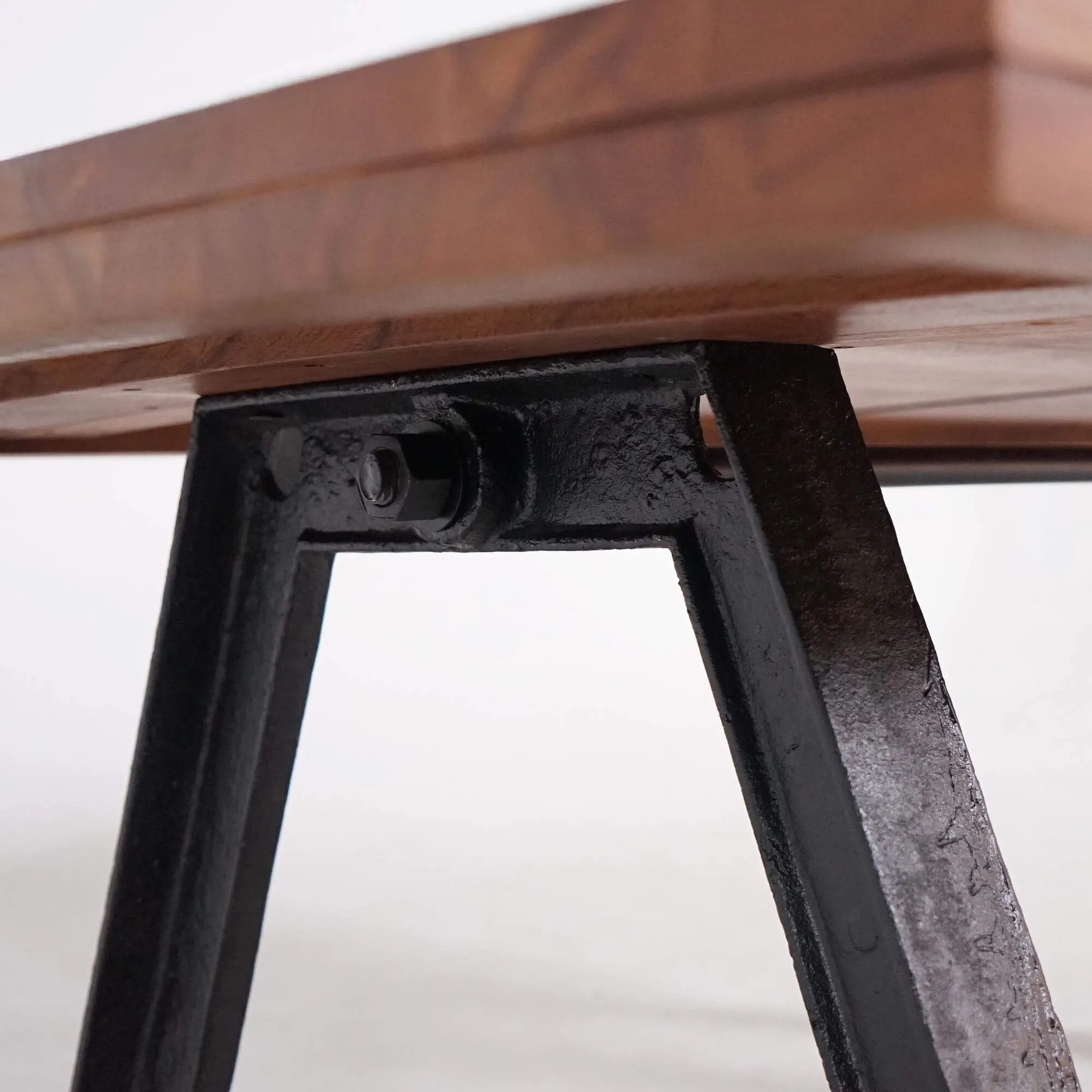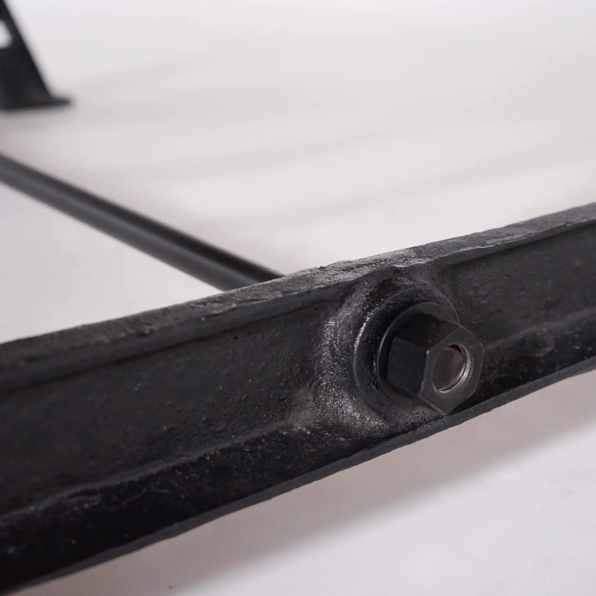 Das Gestell aus schwarzem Gusseisen dieses Esstisches im Industriestil, inspiriert von industriellen Metallstrukturen, verleiht dem Ensemble eine bemerkenswerte Stabilität. Seine schrägen Linien und die zentrale Verstrebung unterstreichen ein Design, das sowohl funktional als auch grafisch ist – geschaffen, um die Zeit zu überdauern, ohne an Modernität zu verlieren. Der Kontrast zwischen der Wärme des Holzes und der Kühle des schwarzen Metalls schafft ein starkes ästhetisches Gleichgewicht, ganz im Sinne des industriellen Charakters unserer wichtigsten Kollektionen.