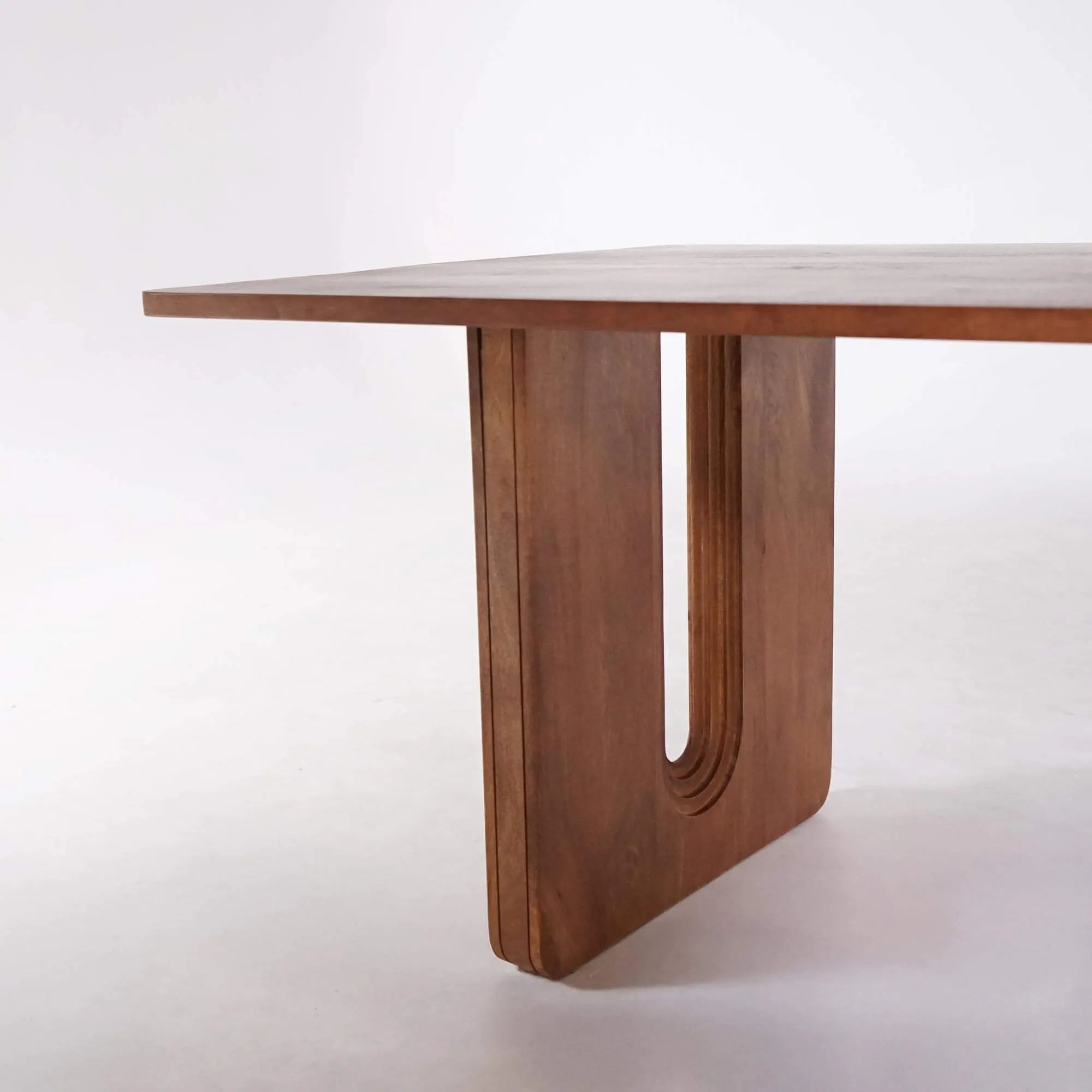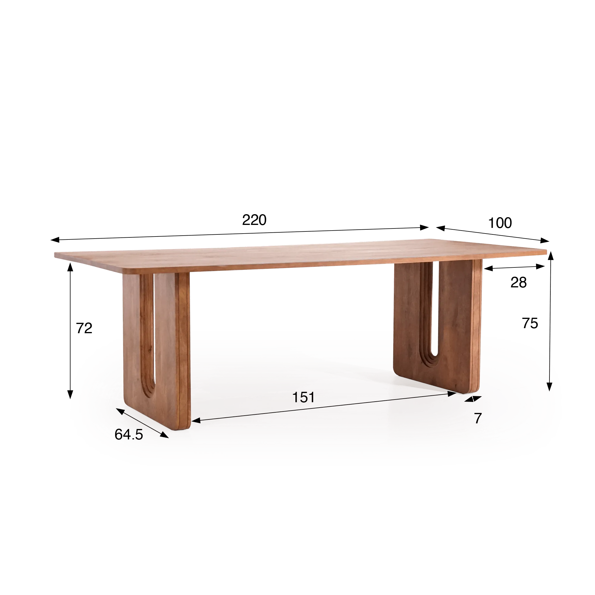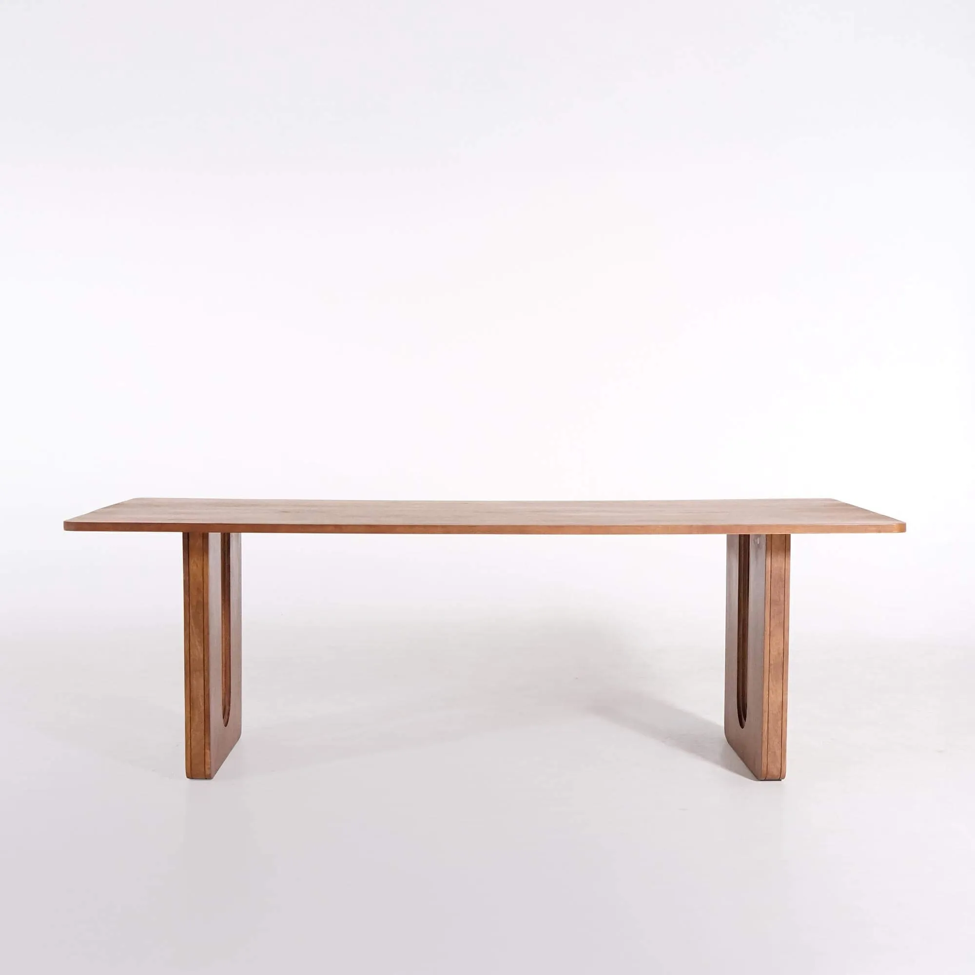 Gefertigt aus massivem Mangoholz offenbart der Noba-Esstisch den ganzen Reichtum dieser edlen Holzart. Sein natürlicher, leicht bernsteinfarbener Braunton spielt mit dem Licht und schafft eine warme, beruhigende Atmosphäre. Die großzügige Tischplatte von 220 × 100 cm ruht auf zwei skulpturalen U-förmigen Beinen, die aus demselben Material gefertigt sind. Ihr Design, zugleich geometrisch und fließend, strukturiert das Gesamtbild und verleiht dem Tisch eine starke, skulpturale Präsenz.