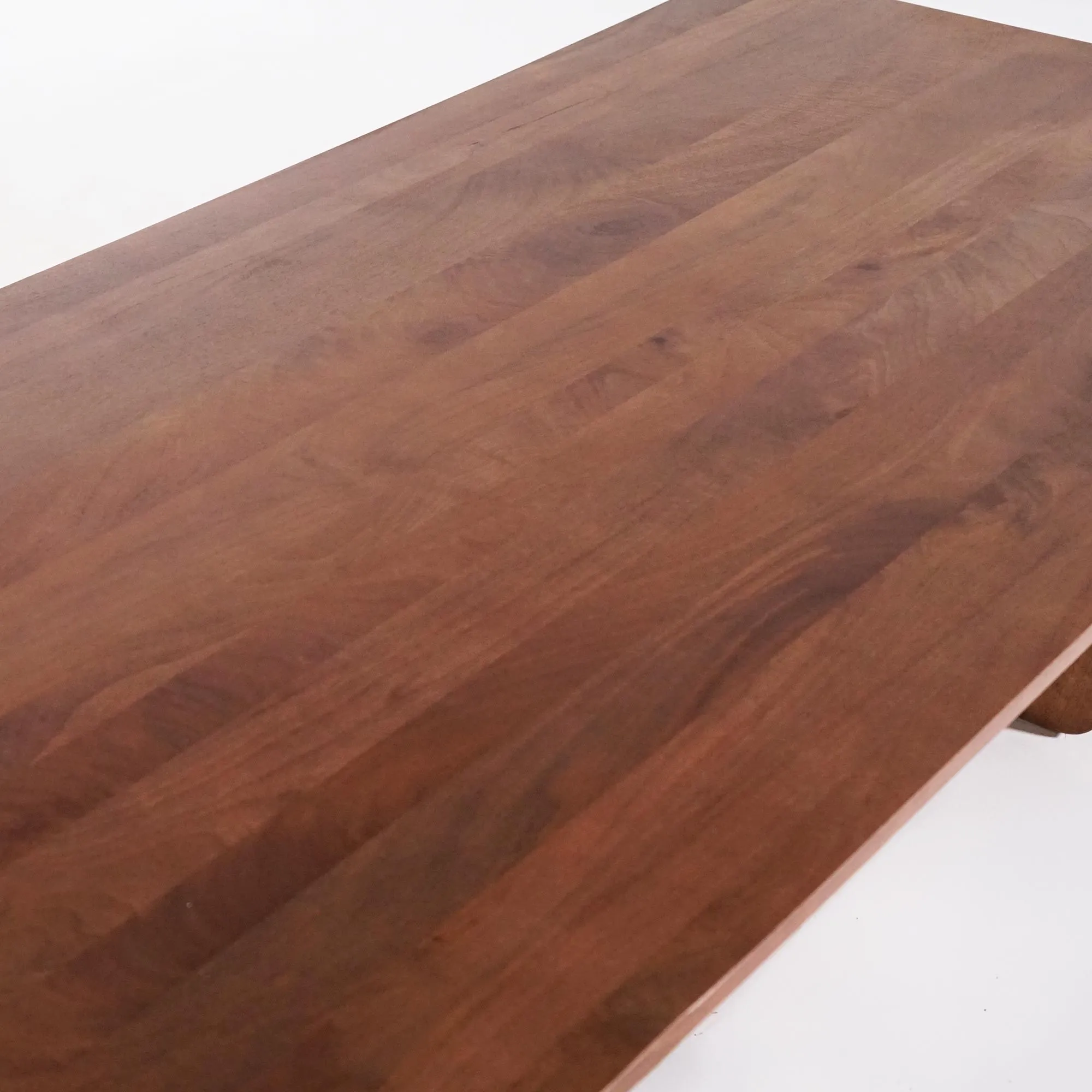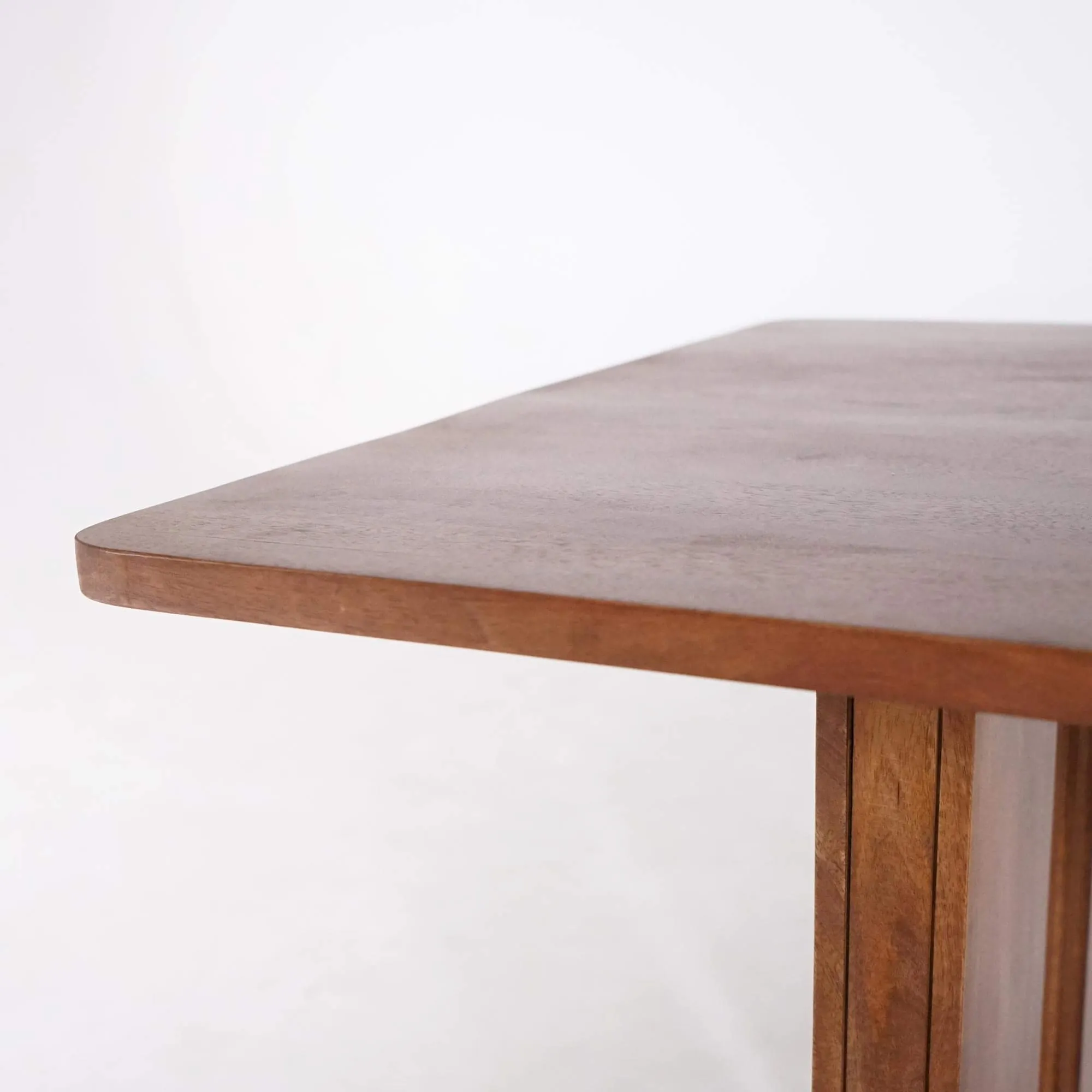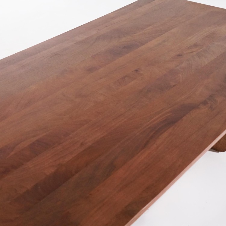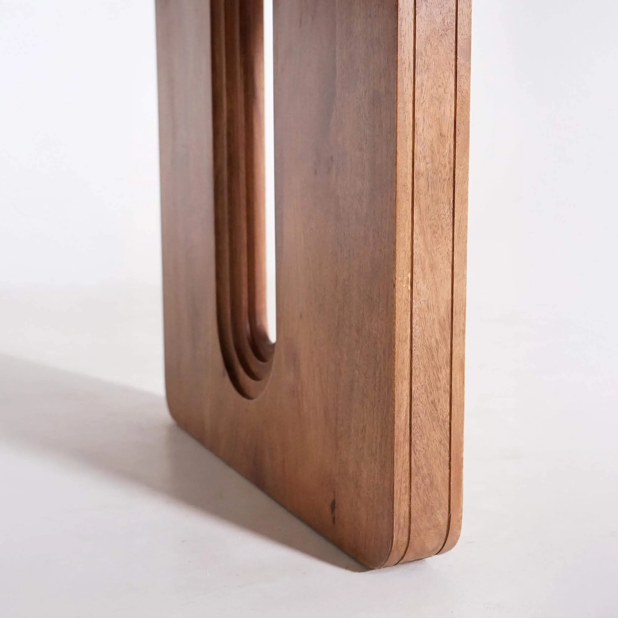 Gefertigt aus massivem Mangoholz offenbart der Noba-Esstisch den ganzen Reichtum dieser edlen Holzart. Sein natürlicher, leicht bernsteinfarbener Braunton spielt mit dem Licht und schafft eine warme, beruhigende Atmosphäre. Die großzügige Tischplatte von 220 × 100 cm ruht auf zwei skulpturalen U-förmigen Beinen, die aus demselben Material gefertigt sind. Ihr Design, zugleich geometrisch und fließend, strukturiert das Gesamtbild und verleiht dem Tisch eine starke, skulpturale Präsenz.