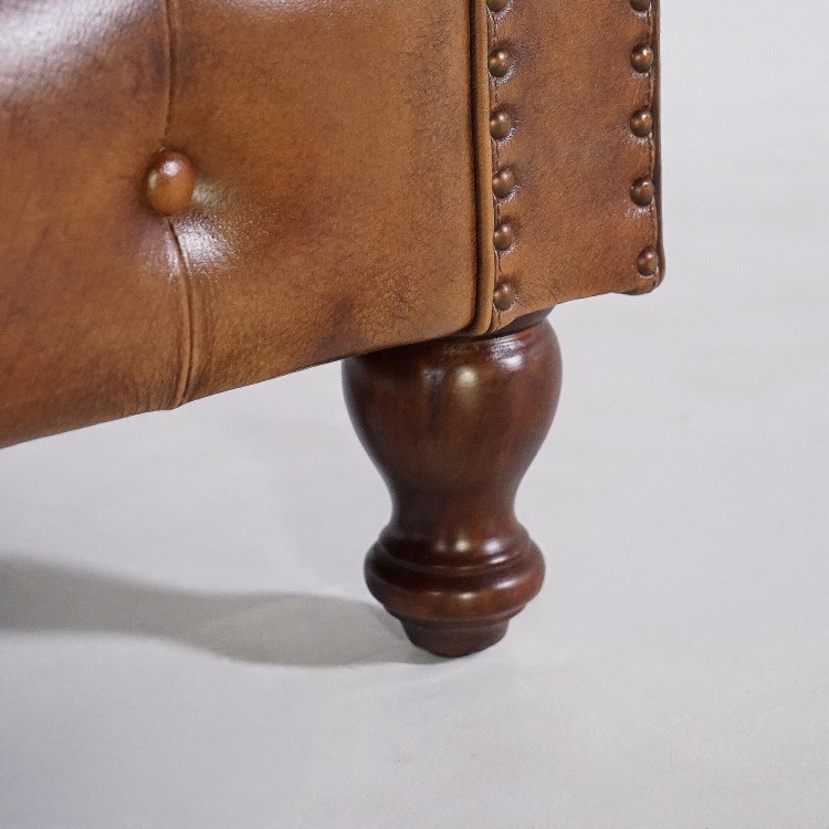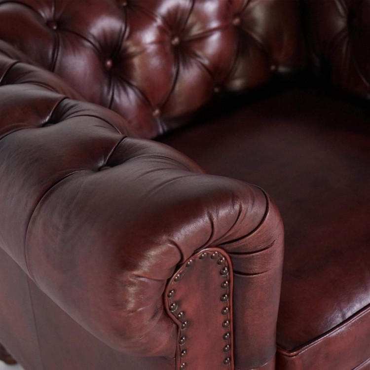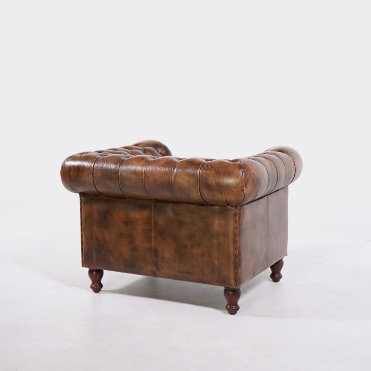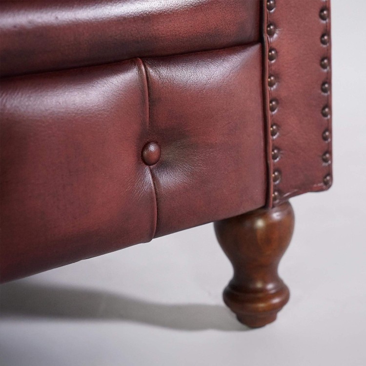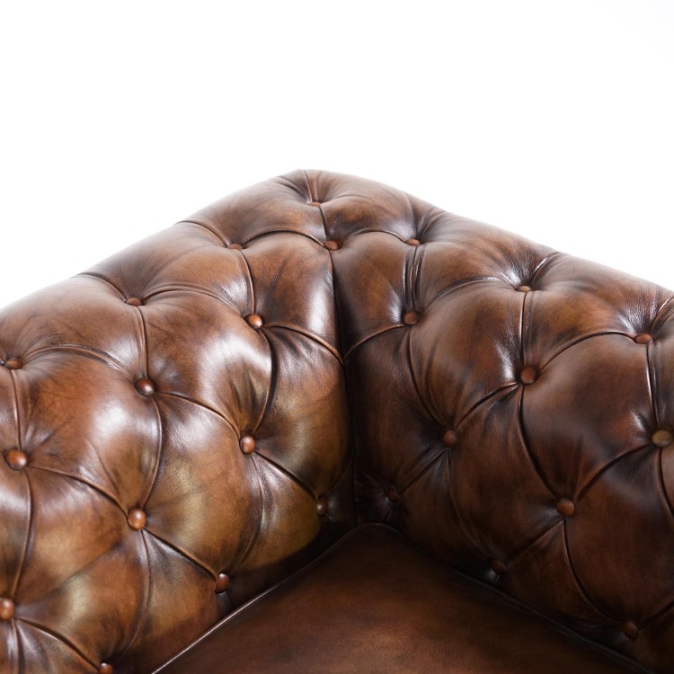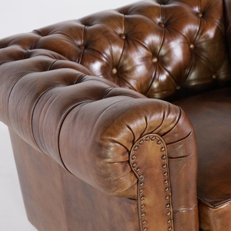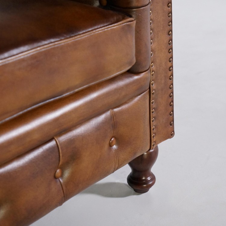 Die tiefe Knopfheftung und die ikonisch gerollten Armlehnen erinnern an die typischen Ledersessel der britischen Oberschicht. Das ausgewählte Vollnarbenleder überzeugt durch seine edle Beschaffenheit und natürliche Widerstandsfähigkeit und entwickelt im Laufe der Zeit eine noch schönere, warme braune Patina. Die genagelten Zierleisten an der Vorderseite unterstreichen die handwerkliche Qualität und zeugen von der Sorgfalt in jedem Herstellungsschritt.