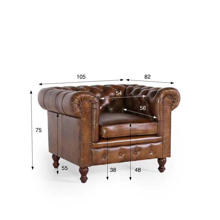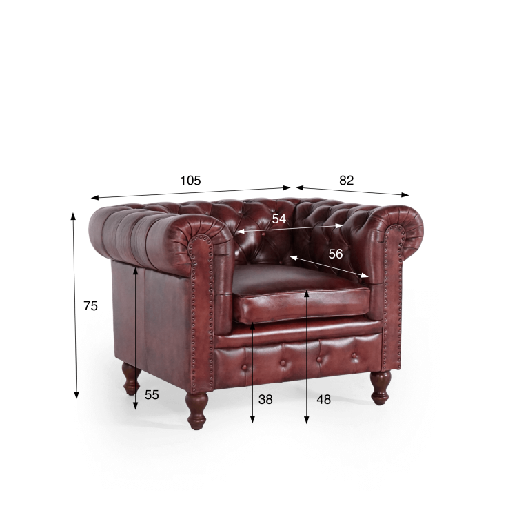 Mit einer Breite von 105 cm, einer Tiefe von 82 cm und einer Gesamthöhe von 75 cm lässt sich dieser Chesterfield-Sessel mühelos in ein klassisches Wohnzimmer, eine moderne Bibliothek oder ein stilvolles Arbeitszimmer integrieren. Die 54 cm breite und 56 cm tiefe Sitzfläche, positioniert auf einer Höhe von 48 cm, bietet hervorragenden Halt. Ergänzt wird sie durch ein abnehmbares, waschbares Kissen mit weichem Sitzkomfort. Die gedrechselten Füße aus Mangoholz, die bei Lieferung einfach zu montieren sind, verleihen zusätzliche Eleganz und sorgen für langanhaltende Stabilität.