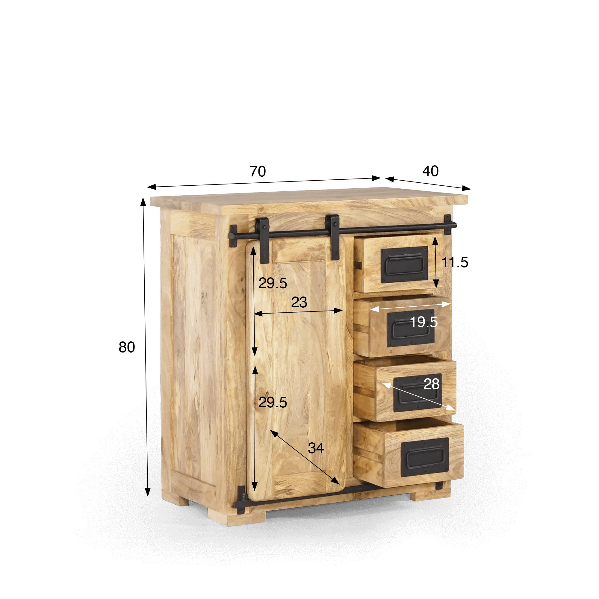 Rechts bieten vier Schubladen (Innenmaße: B28 x T19,5 x H11,5 cm) Platz für Flakons, Pflegeprodukte oder kleine Textilien. Die Metallgriffe im Industriestil, angebracht an Fronten aus rohem Holz, unterstreichen den Charakter des Möbelstücks und sorgen für eine angenehme Handhabung.