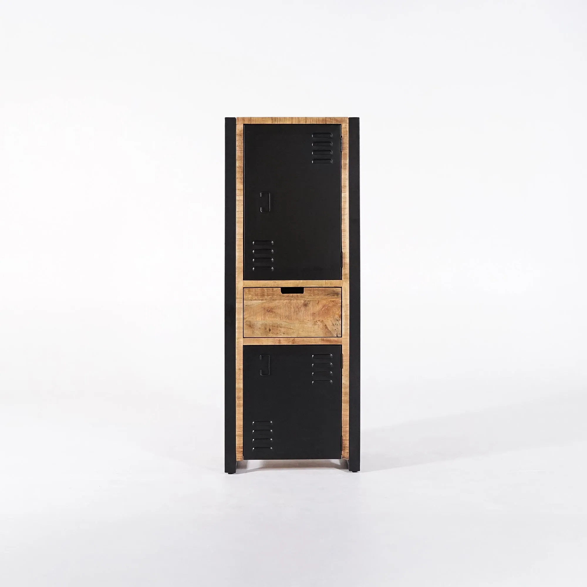 Mit diesem Massivholzschrank aus Mangoholz mit Metalltür Kansas wollten wir den Geist alter industrieller Möbel neu interpretieren und ihm eine wärmere, moderne Ausstrahlung verleihen. Unsere Designer haben mit einem starken Kontrast gearbeitet — der Sanftheit von massivem Mangoholz und der Intensität von mattem Schwarzmetall — um ein charakterstarkes Möbelstück zu schaffen, das den Alltag mit Ehrlichkeit und Robustheit begleitet.